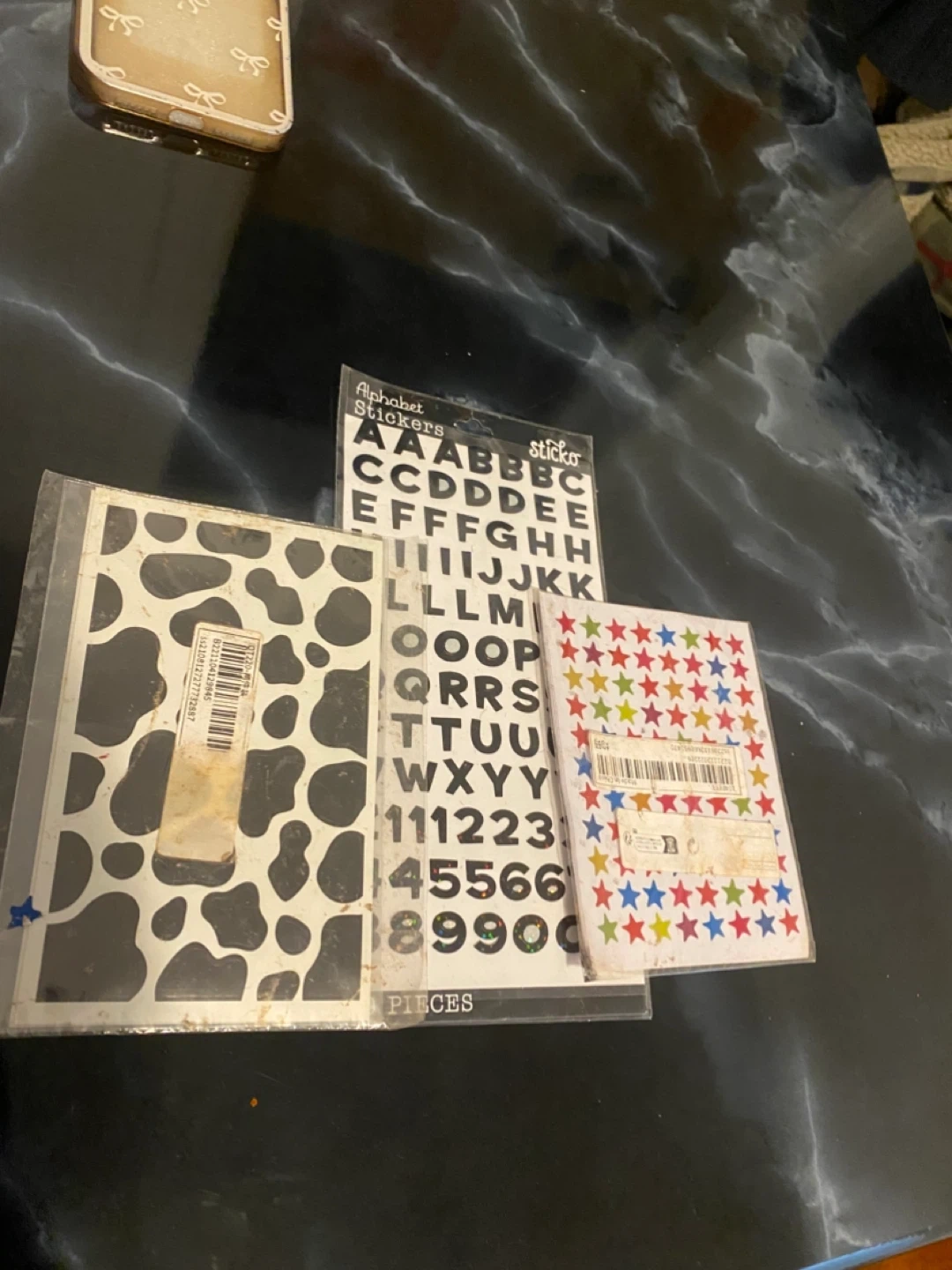 This lot includes a sheet of alphabet stickers and two decorative sticker sheets. One sheet features a cow print design, and the other has colorful stars. Great for crafts and personalization!