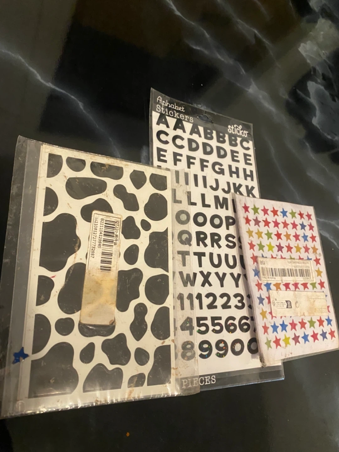 This lot includes a sheet of alphabet stickers and two decorative sticker sheets. One sheet features a cow print design, and the other has colorful stars. Great for crafts and personalization!