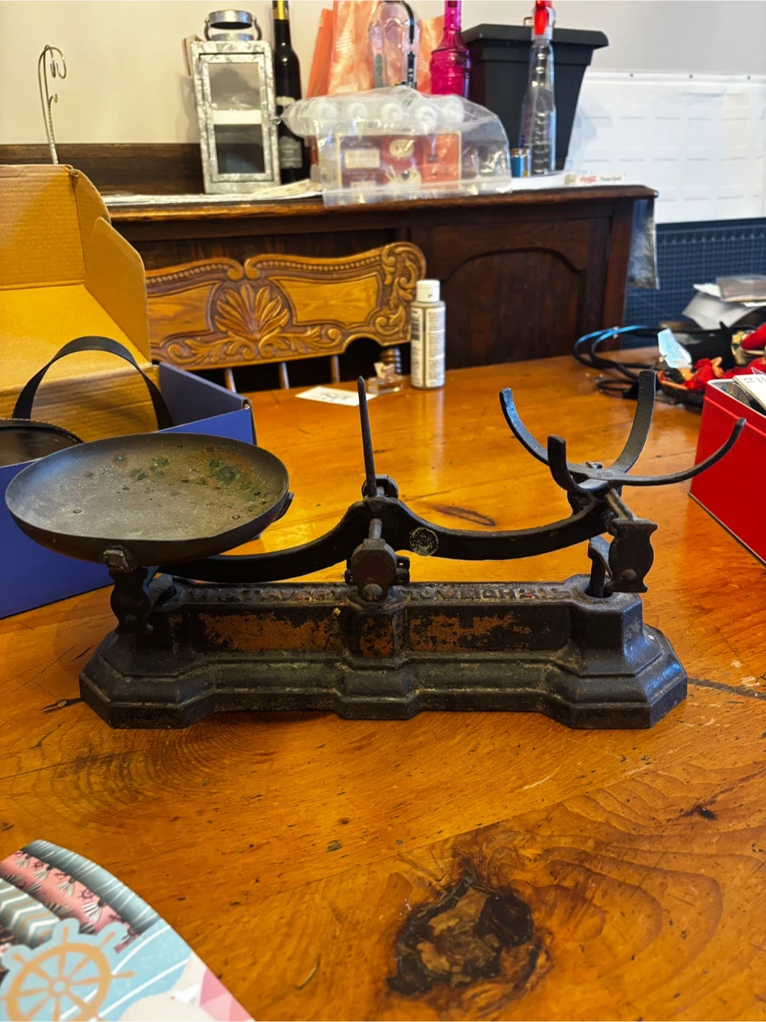 This is a vintage cast iron balance scale. It's made of metal with two weighing pans. The base has some decorative etching. Great for display or light use!