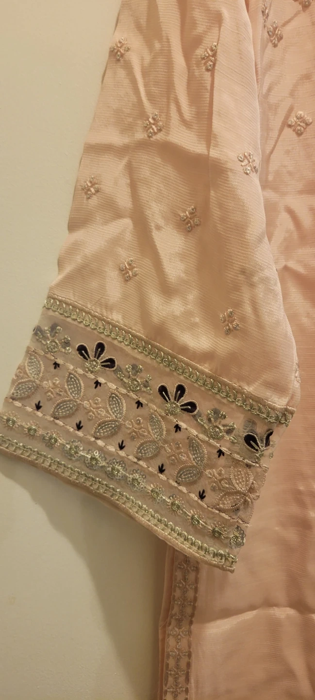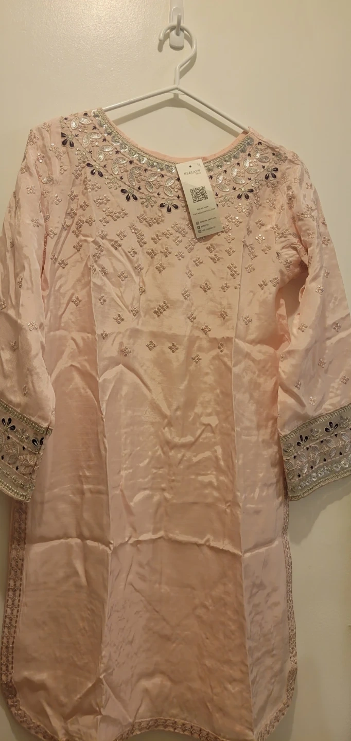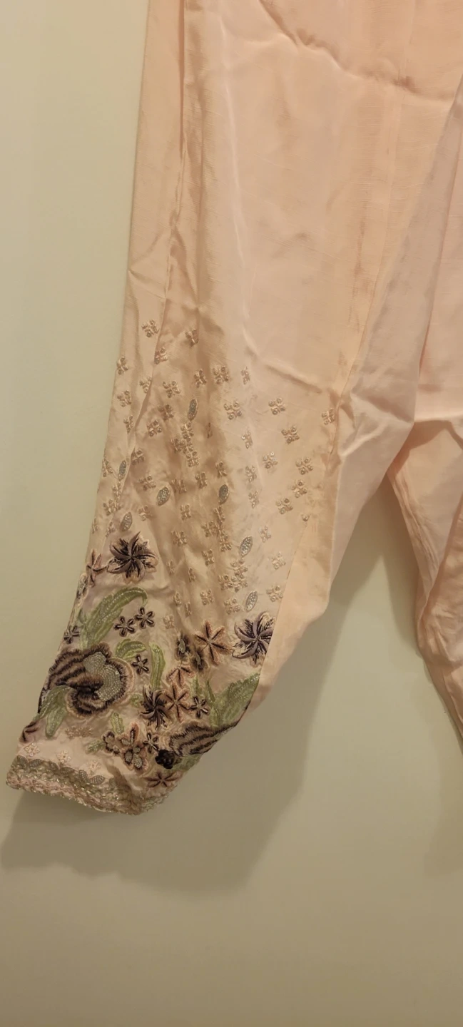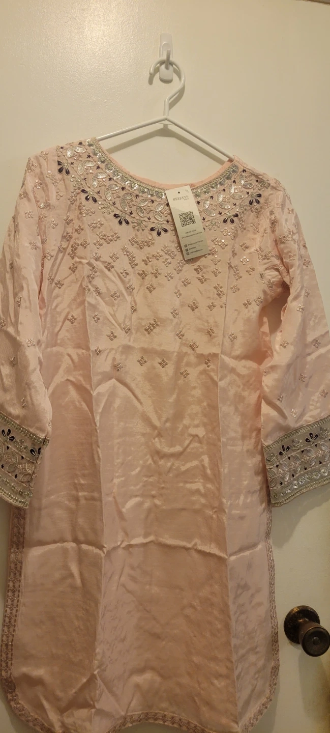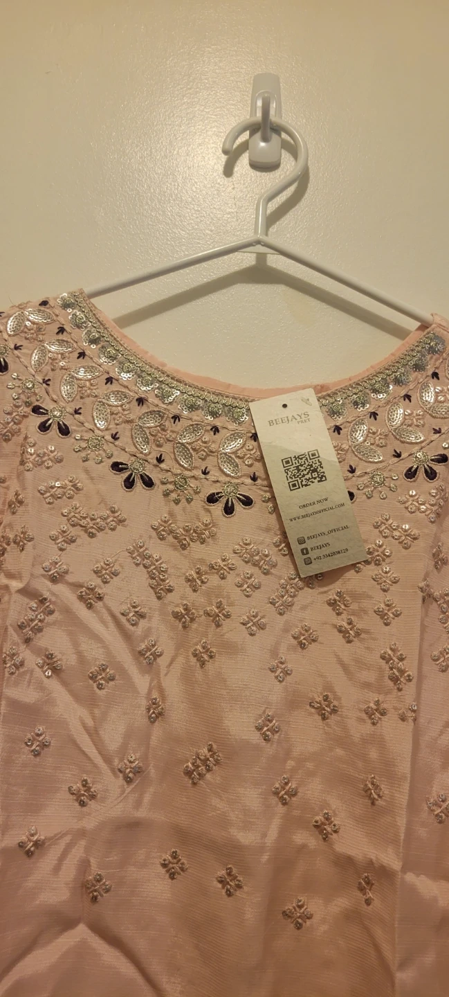 This is a pink kurti and pants set from Beejays. It features intricate embroidery with sequins and beadwork on the neckline, sleeves, and hem of the kurti, and on the cuffs of the pants. The fabric appears to be a shimmering silk or satin blend. A beautiful outfit for special occasions!