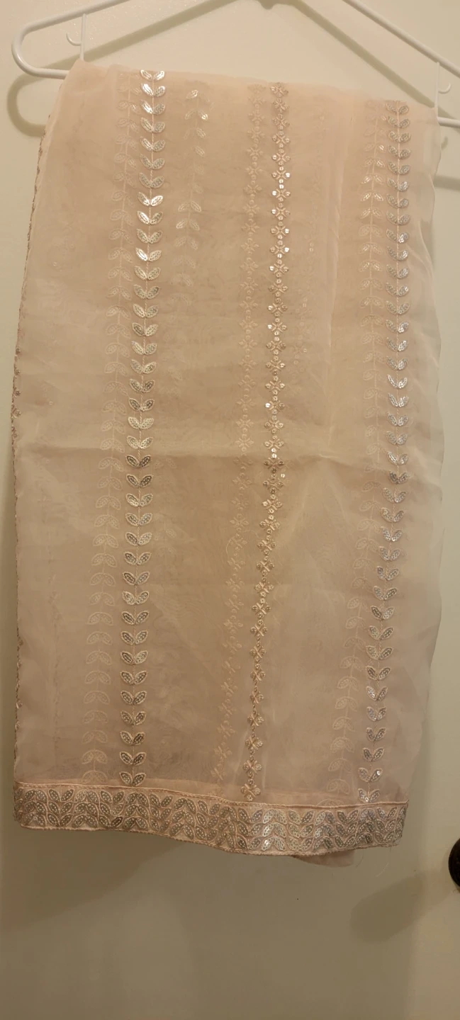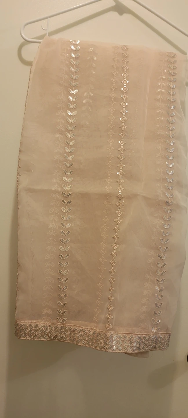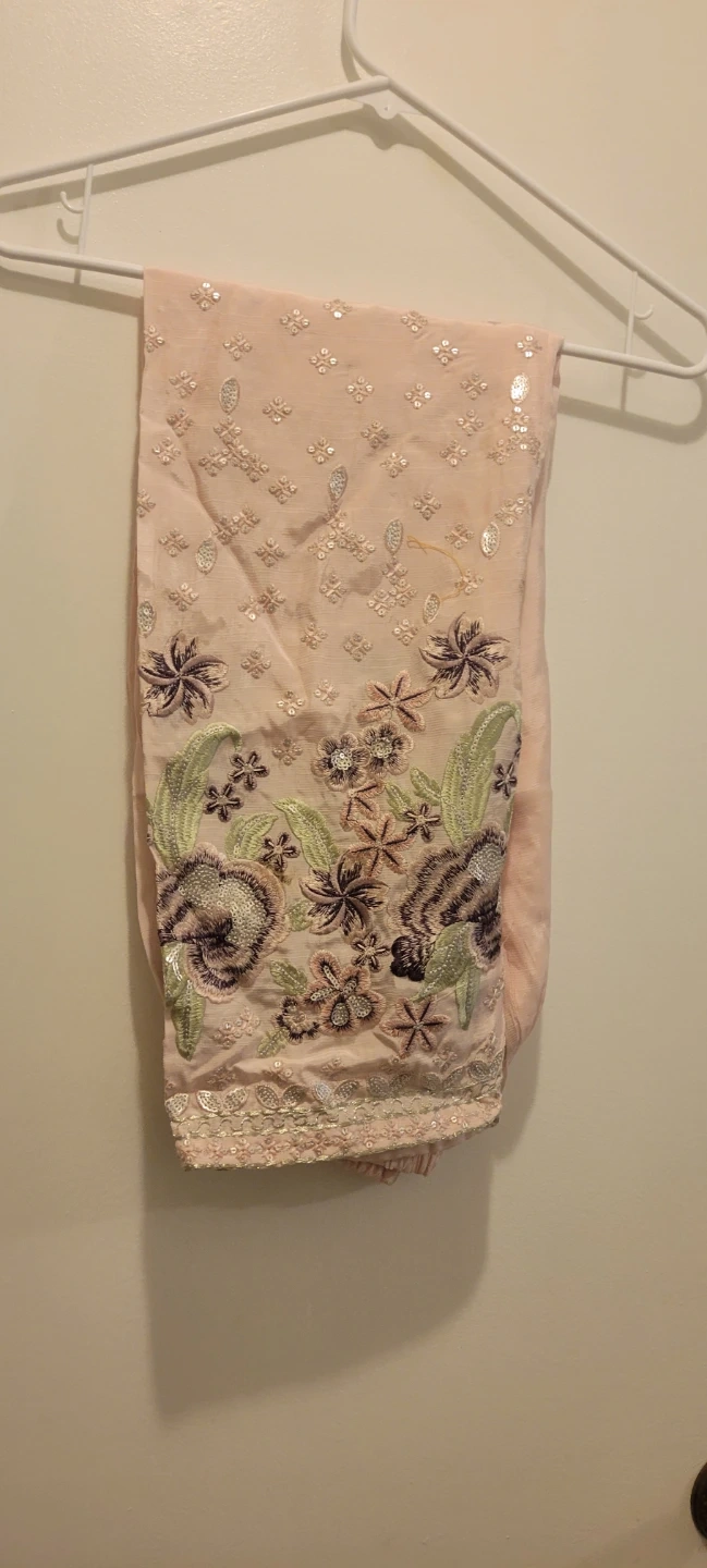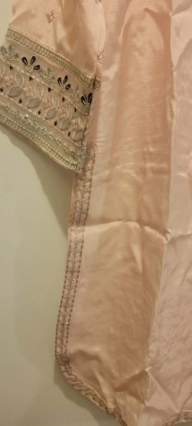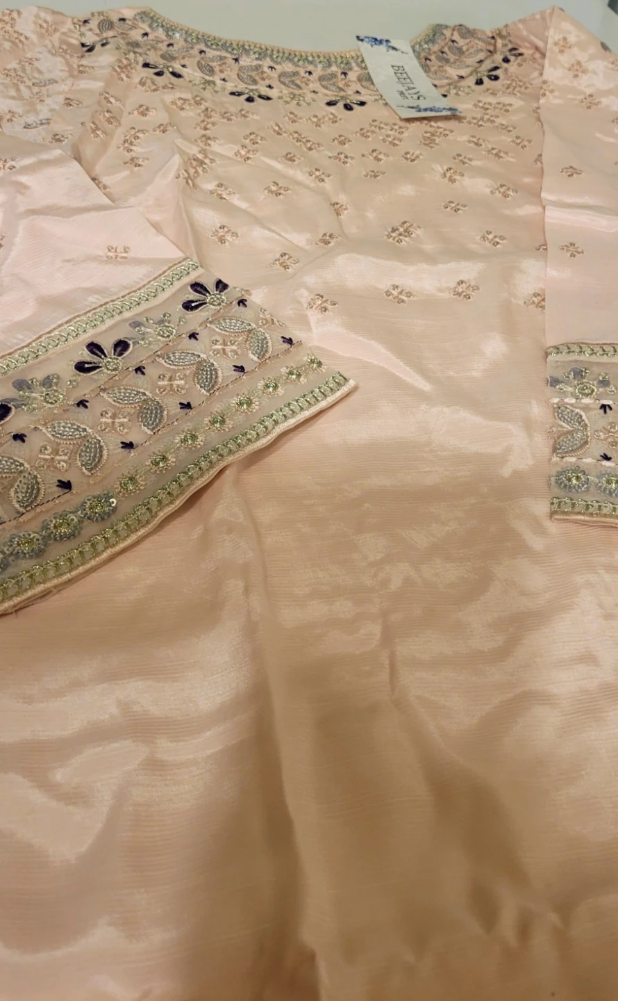 This is a pink kurti and pants set from Beejays. It features intricate embroidery with sequins and beadwork on the neckline, sleeves, and hem of the kurti, and on the cuffs of the pants. The fabric appears to be a shimmering silk or satin blend. A beautiful outfit for special occasions!