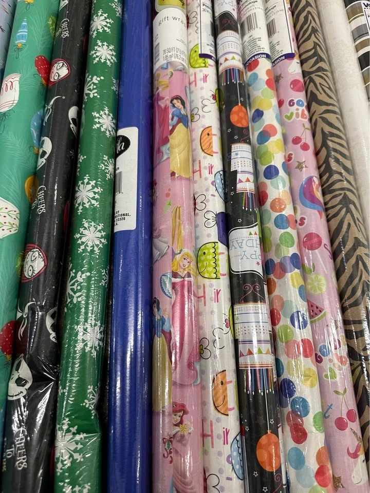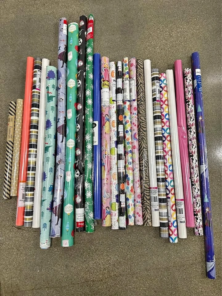 Large assorted lot of gift wrap rolls in a variety of prints and colors. Most rolls are still sealed, and a few have some light dents or wrinkles from storage, but overall this is a great set in very good condition. Perfect for birthdays, holidays, crafts or everyday gift wrapping. Sold as a full lot only. Please see photos for styles and condition. Pickup in Buffalo Grove.