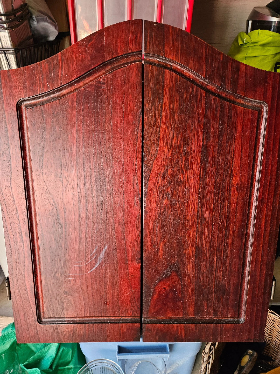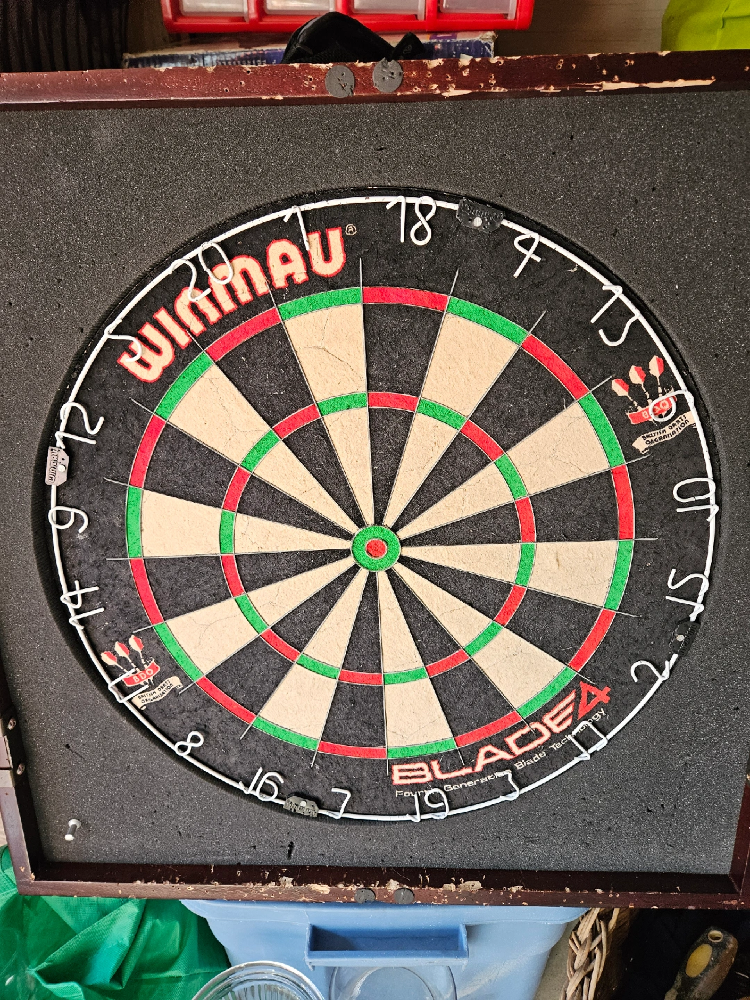 Selling a Winmau dartboard cabinet set. The cabinet is made of wood and has a dark red finish. The dartboard itself is a Winmau Blade 4.