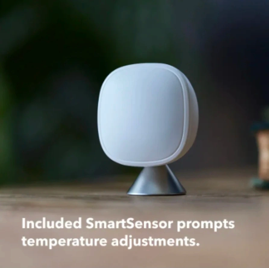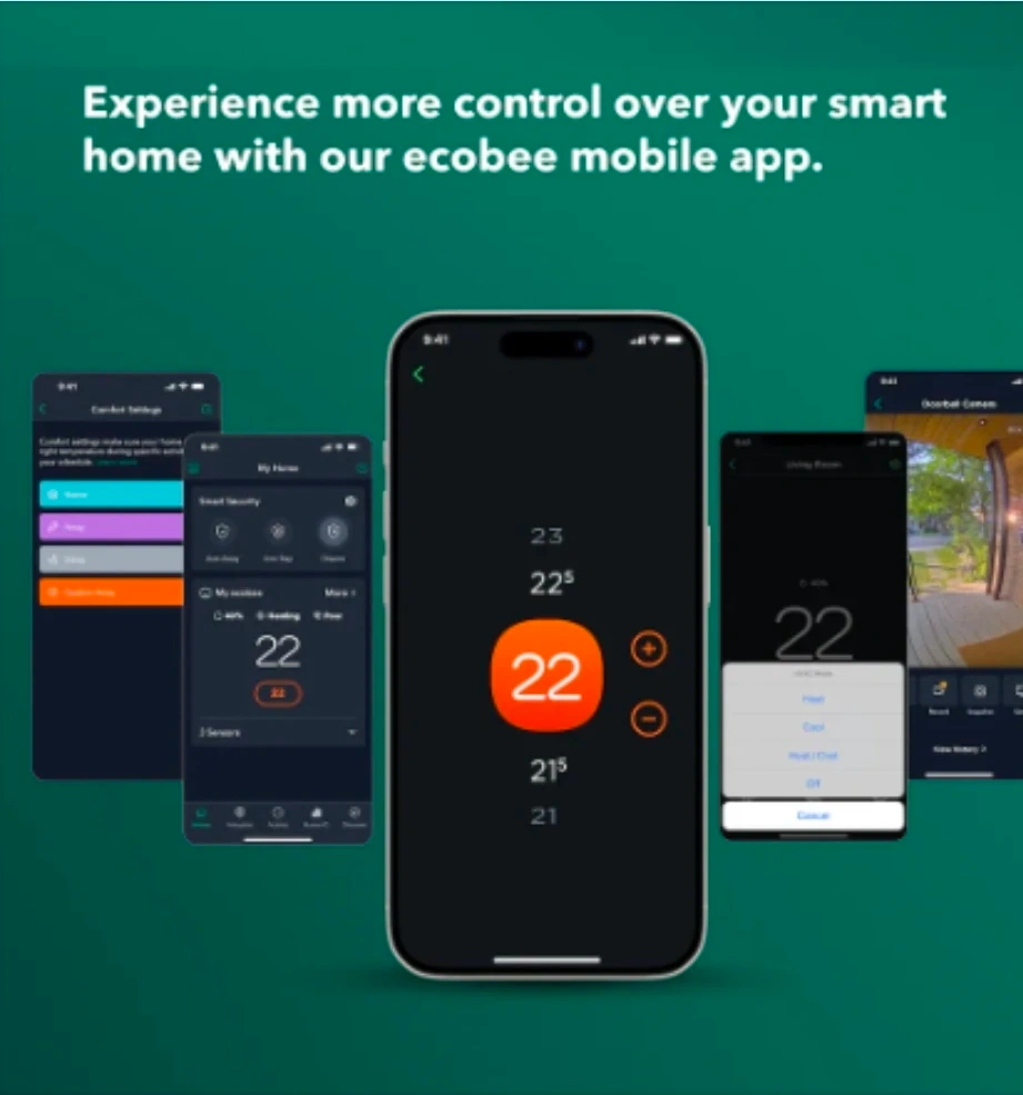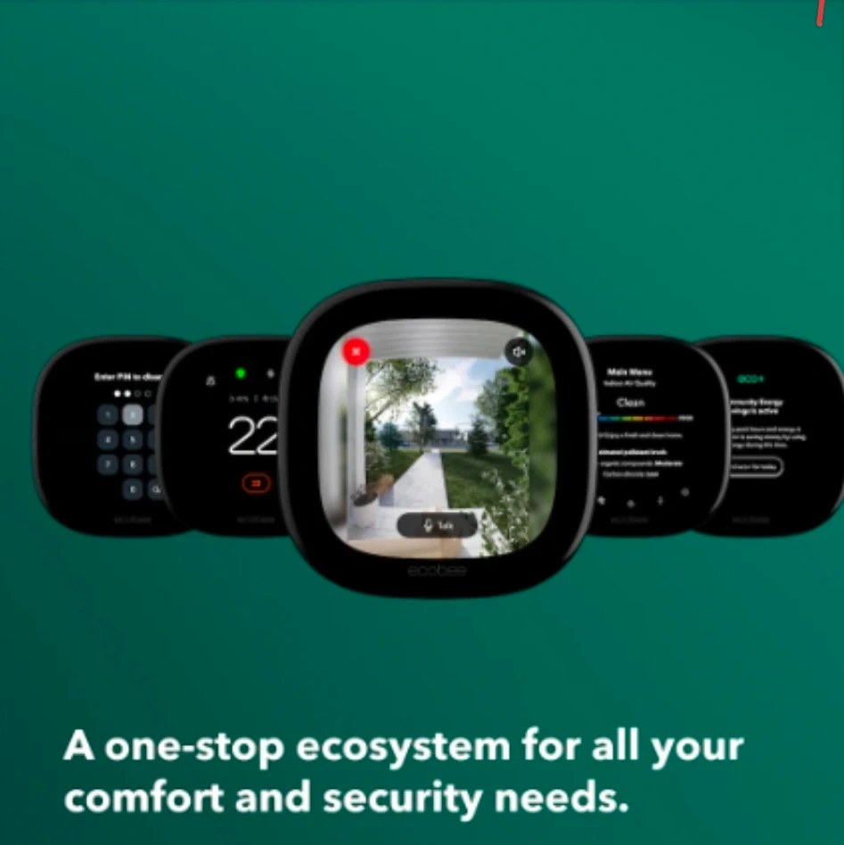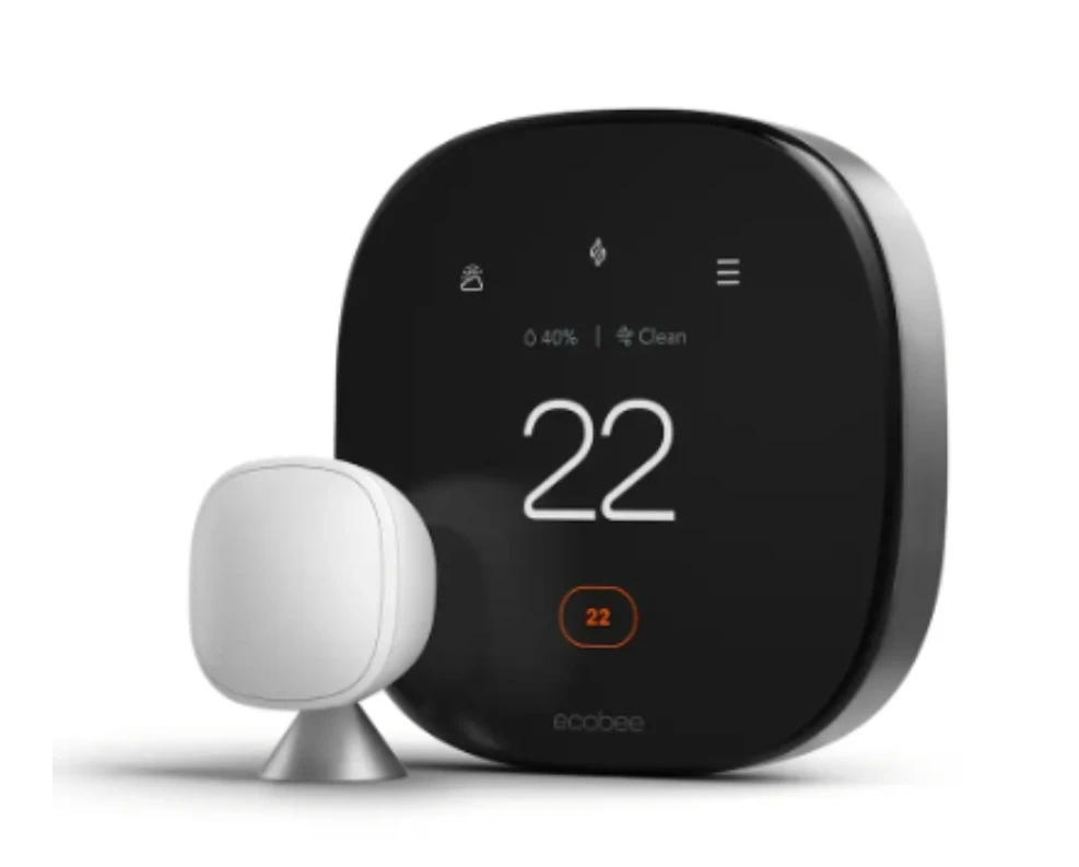 Ecobee Smart Thermostat with Voice Control and an included SmartSensor for temperature adjustments. Control your smart home from your phone with the Ecobee app. This system offers a one-stop ecosystem for comfort and security needs.