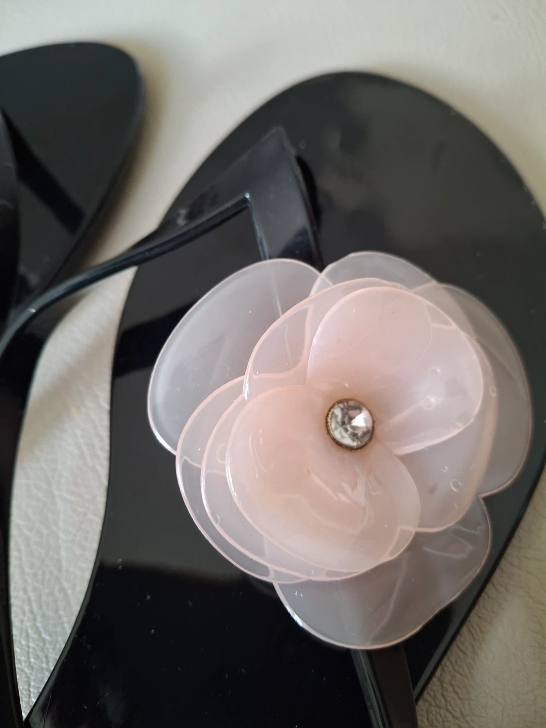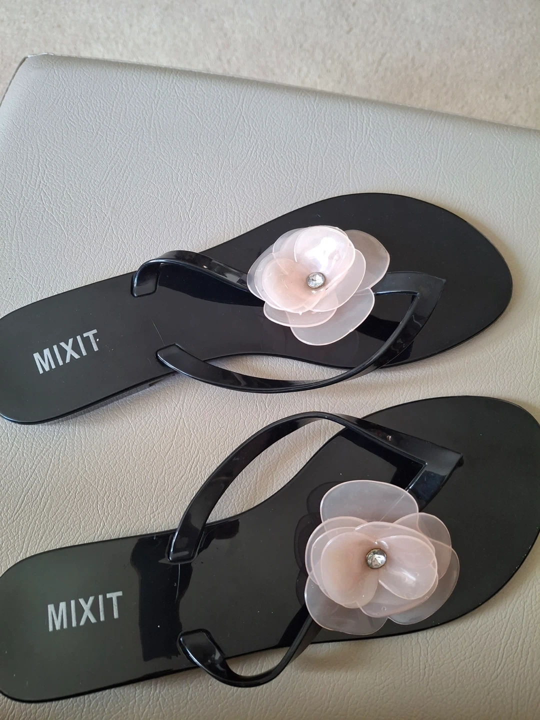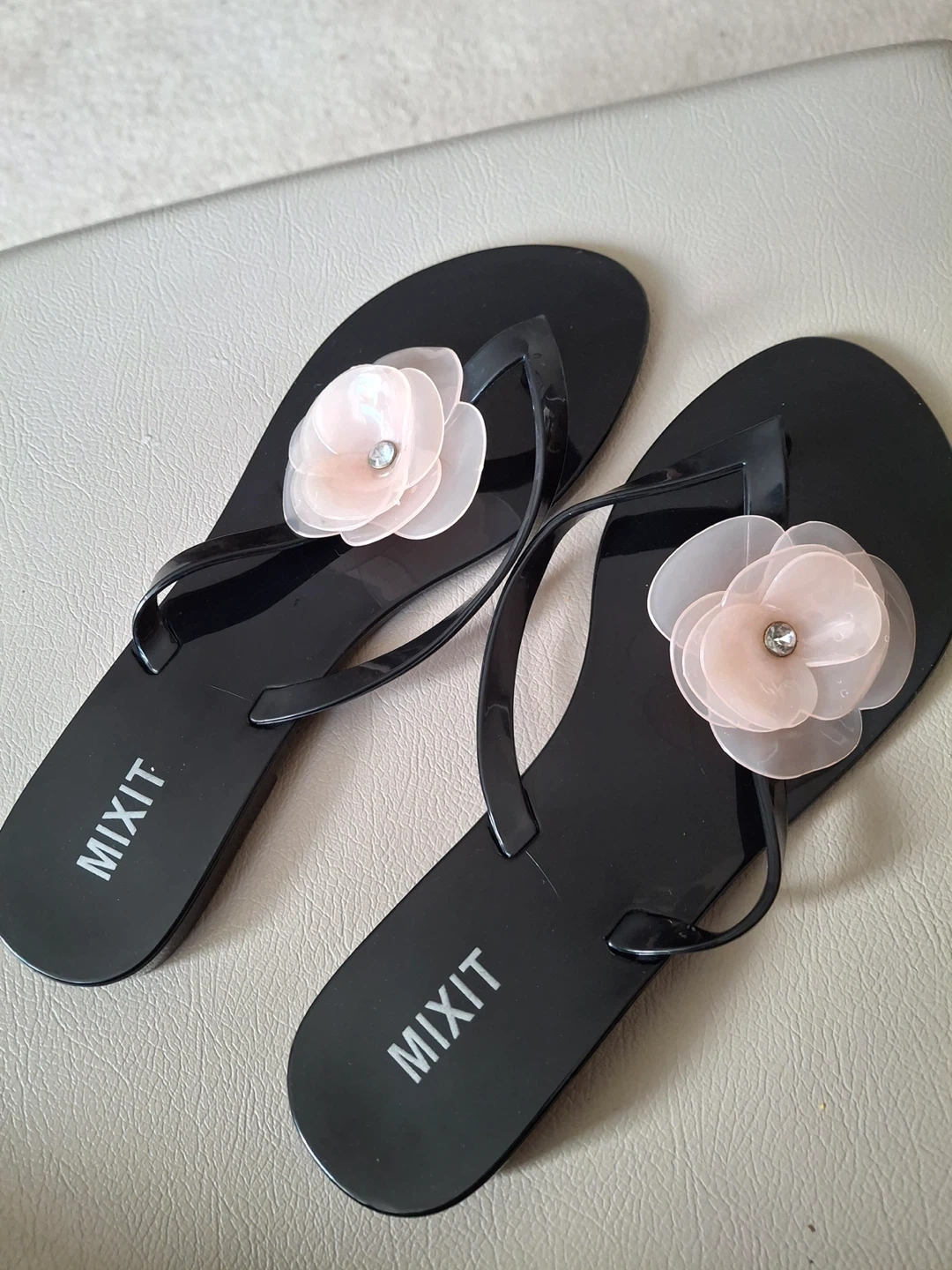Black flat sandals/flip flops with cute pink flower detail. MIXIT brand. Never been worn. Size 8, Eur 39. One small indent on right shoe as shown in last photo.