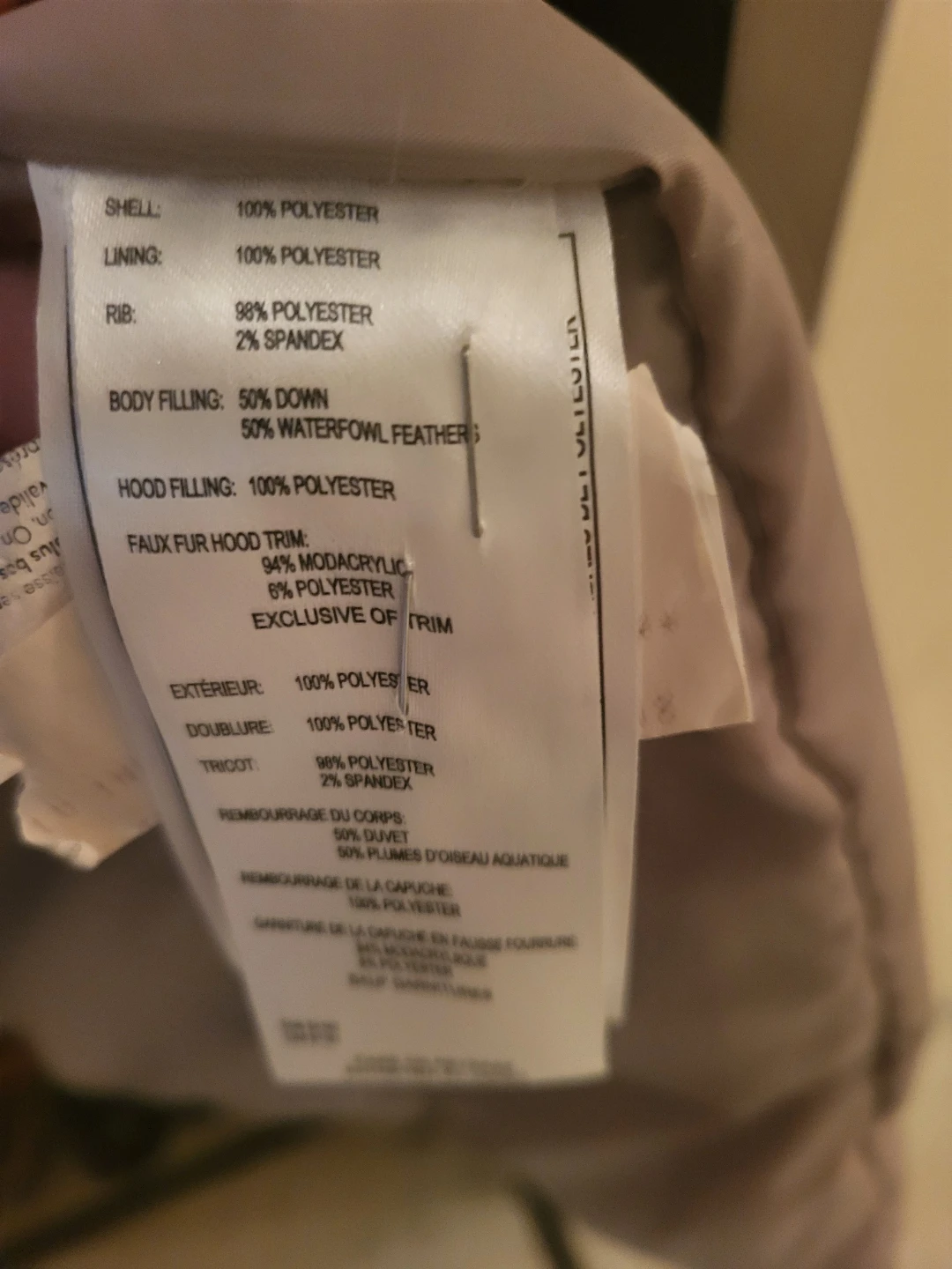 - Faux Fur Hood Trim: 94% Modacrylic, 6% Polyester