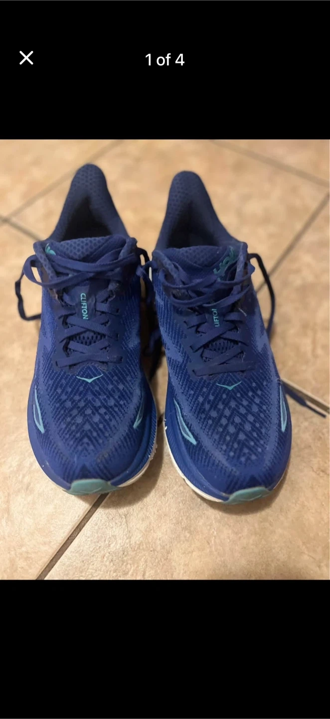 These are a pair of blue Hoka Clifton running shoes. They're designed for comfort and performance. Good for road running!