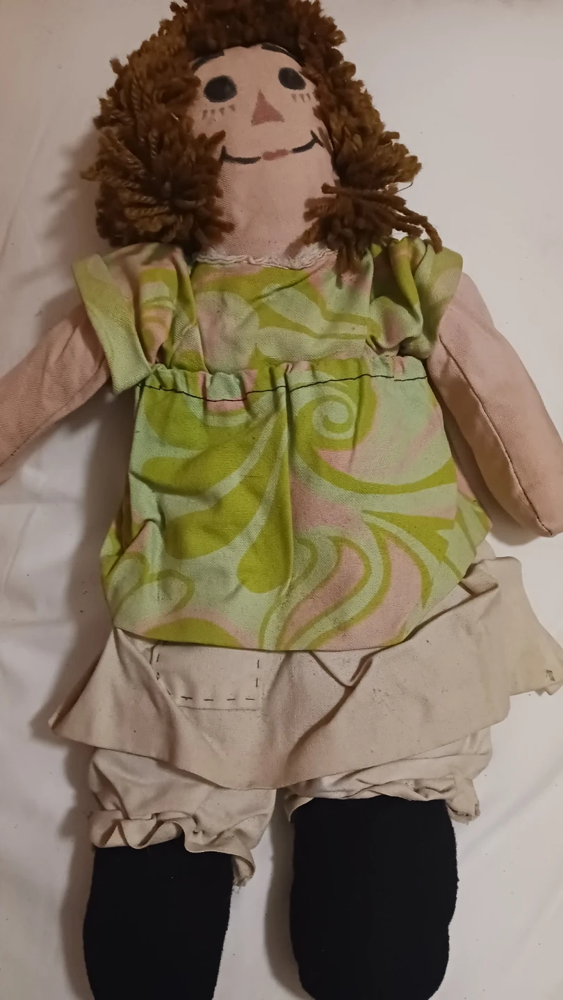 Vintage Raggedy Ann and Andy fabric dolls. Both dolls have yarn hair, button eyes, and embroidered smiles. They're dressed in coordinating outfits. Andy wears a red scarf, white shirt, blue pants, and black socks. Ann wears a green patterned crinoline and a tan dress with ruffled trim. These dolls are made of fabric with soft stuffing. They are not meant to be played with at almost 50 years old. Sold separately in price but as a pair $40.
