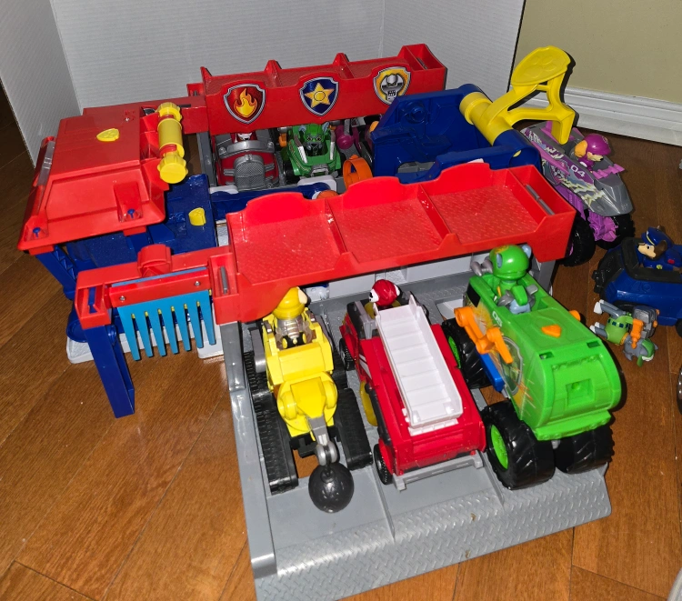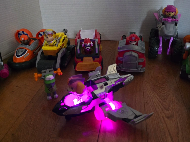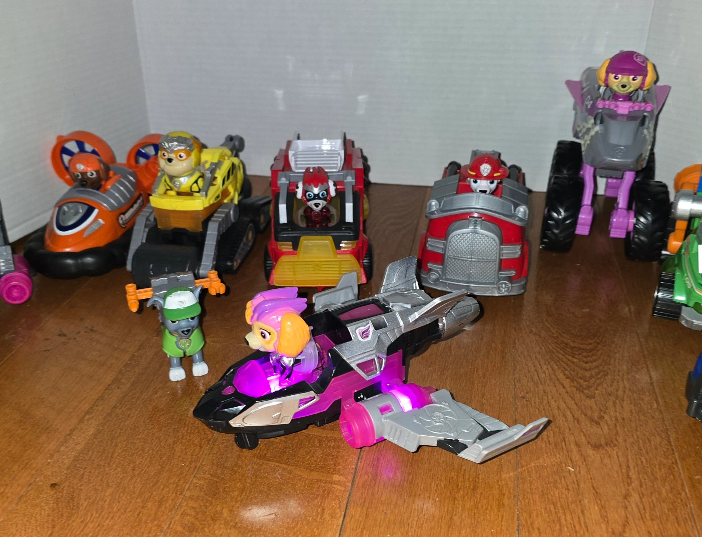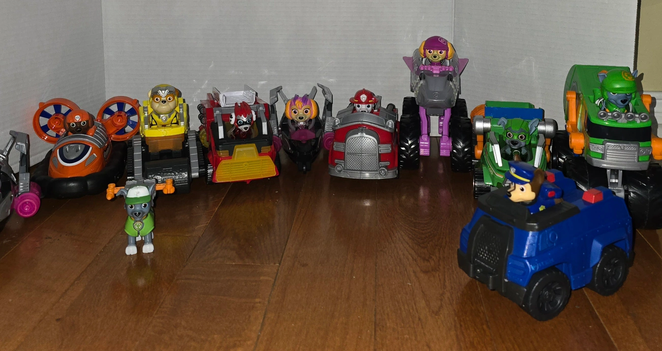 This is a collection of 9 Paw Patrol vehicles and figures and car wash. Includes characters like Chase, Marshall, Skye, Zuma, Rockie and Rubble in their respective vehicles. Many of the vehicles have lights and sounds. It's a great set for any Paw Patrol fan!