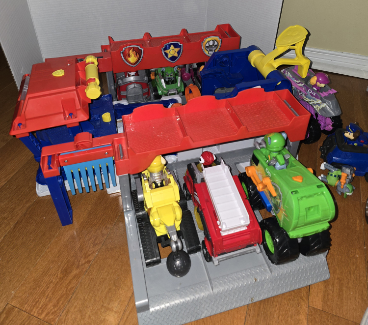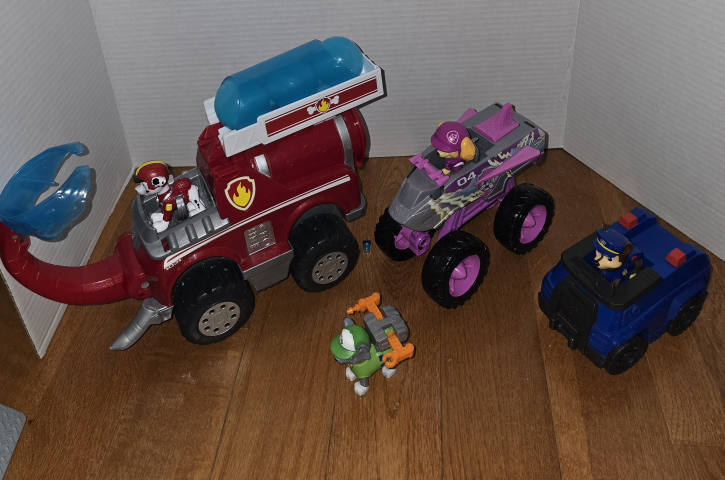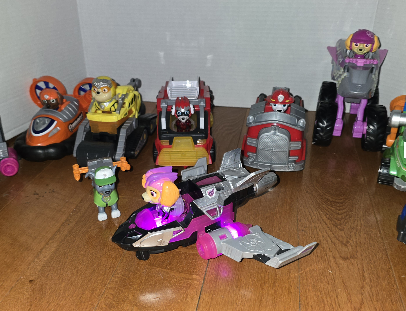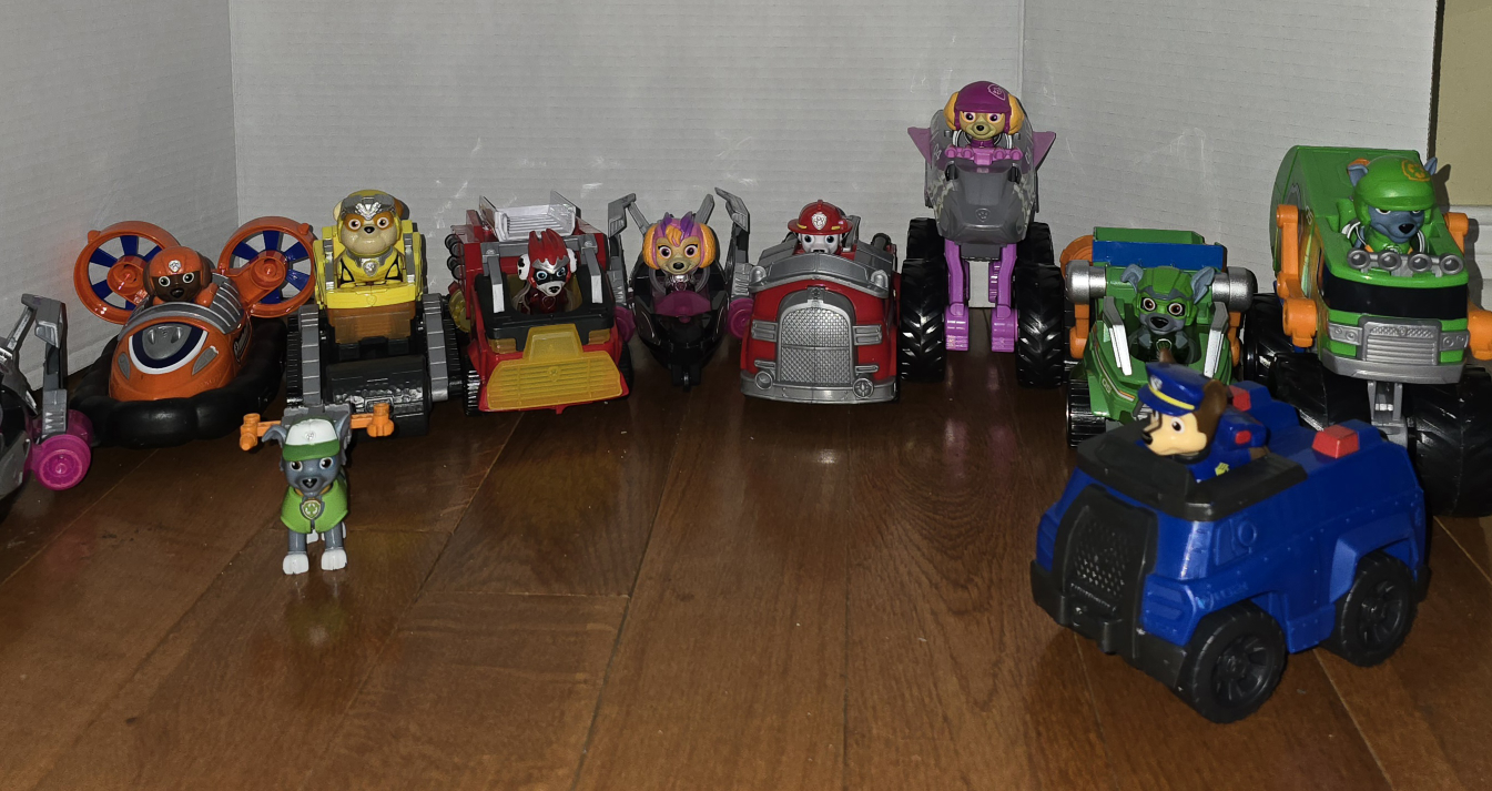 This is a collection of 9 Paw Patrol vehicles and figures and car wash. Includes characters like Chase, Marshall, Skye, Zuma, Rockie and Rubble in their respective vehicles. Many of the vehicles have lights and sounds. It's a great set for any Paw Patrol fan!