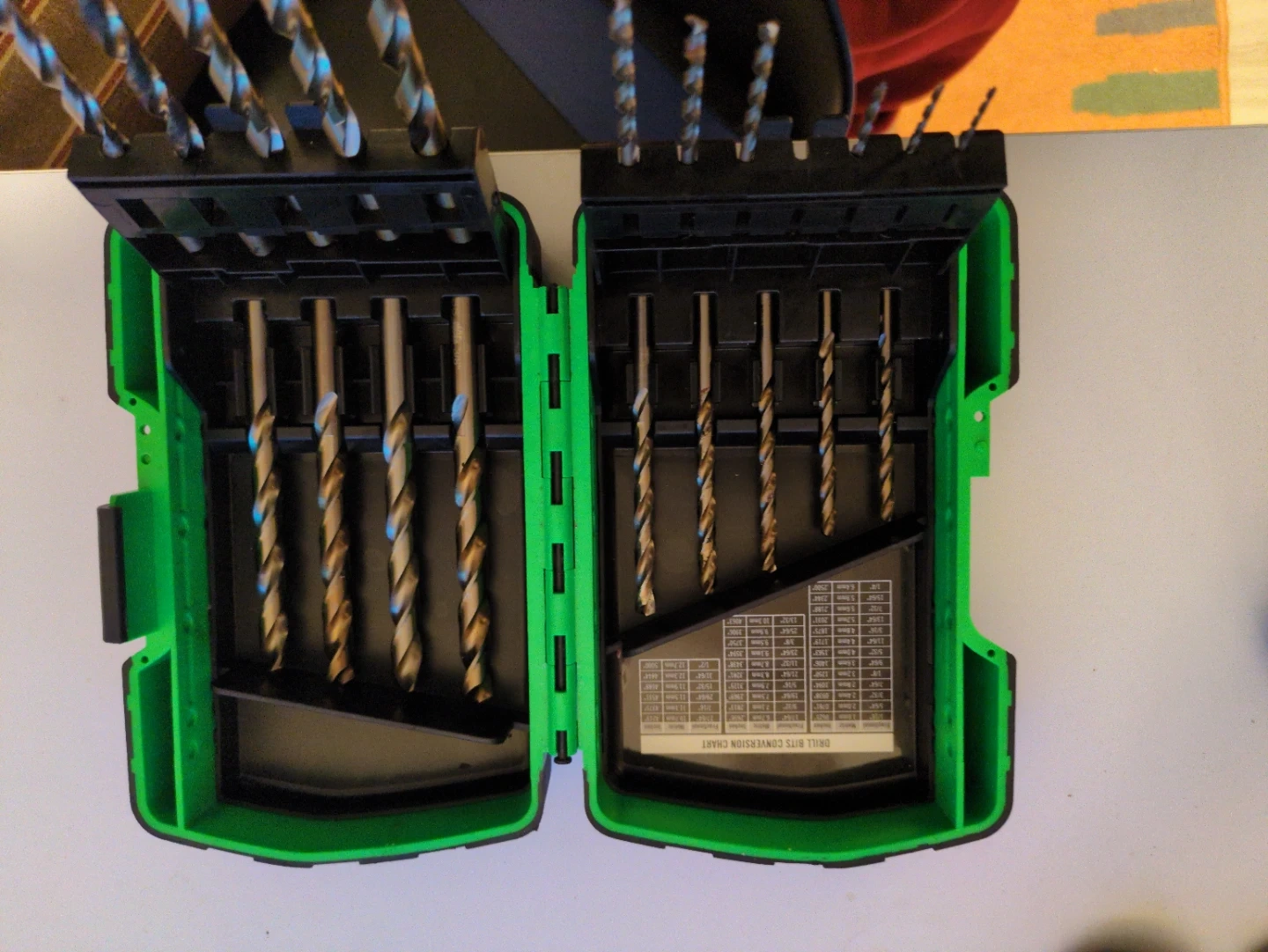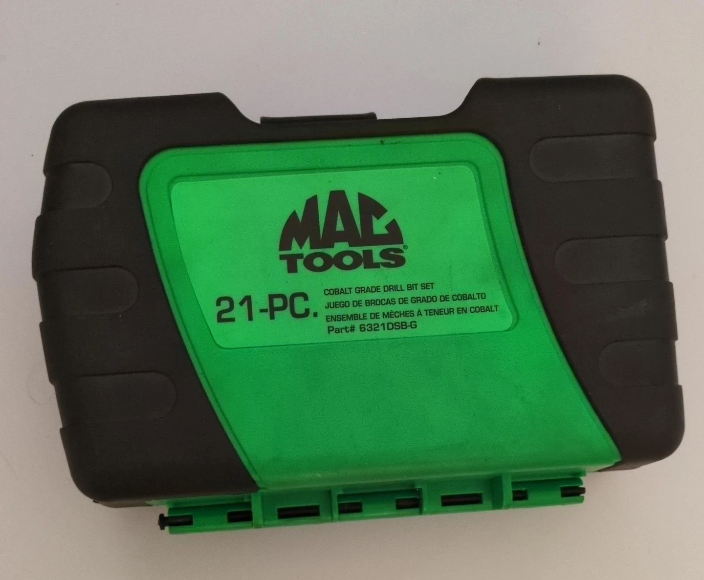 234Selling a MAC Tools 21-piece cobalt grade drill bit set. Comes in a green and black case. Includes a drill bits conversion chart inside the case. Its missing only 7/64 drill bit.