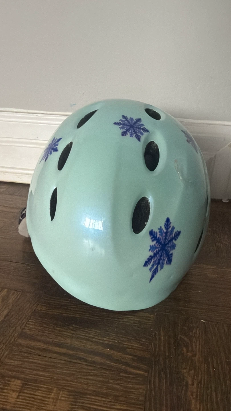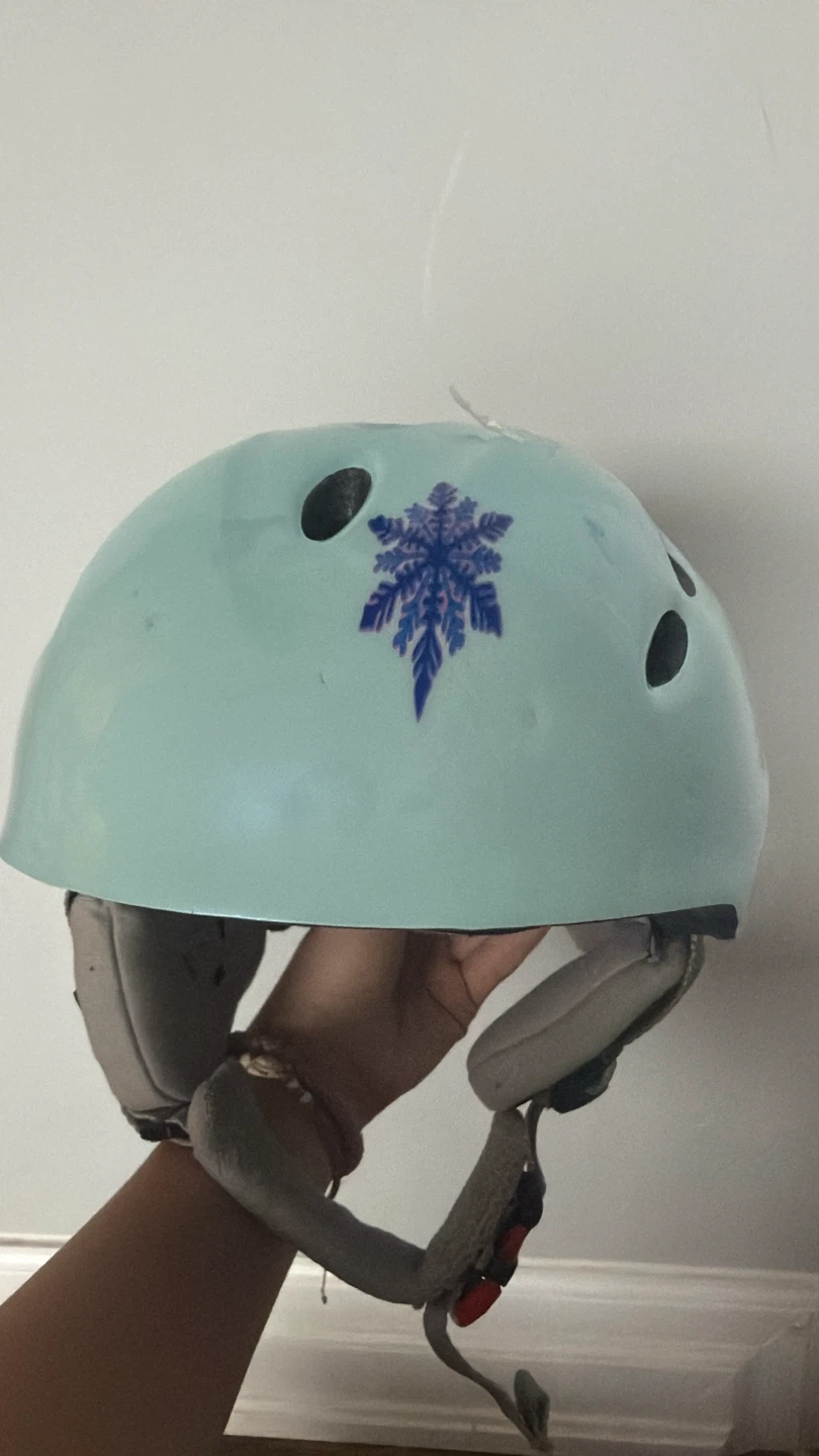 This is a light blue helmet with snowflake decals. It features a soft interior lining for comfort. Adjustable straps ensure a snug fit for various head sizes.