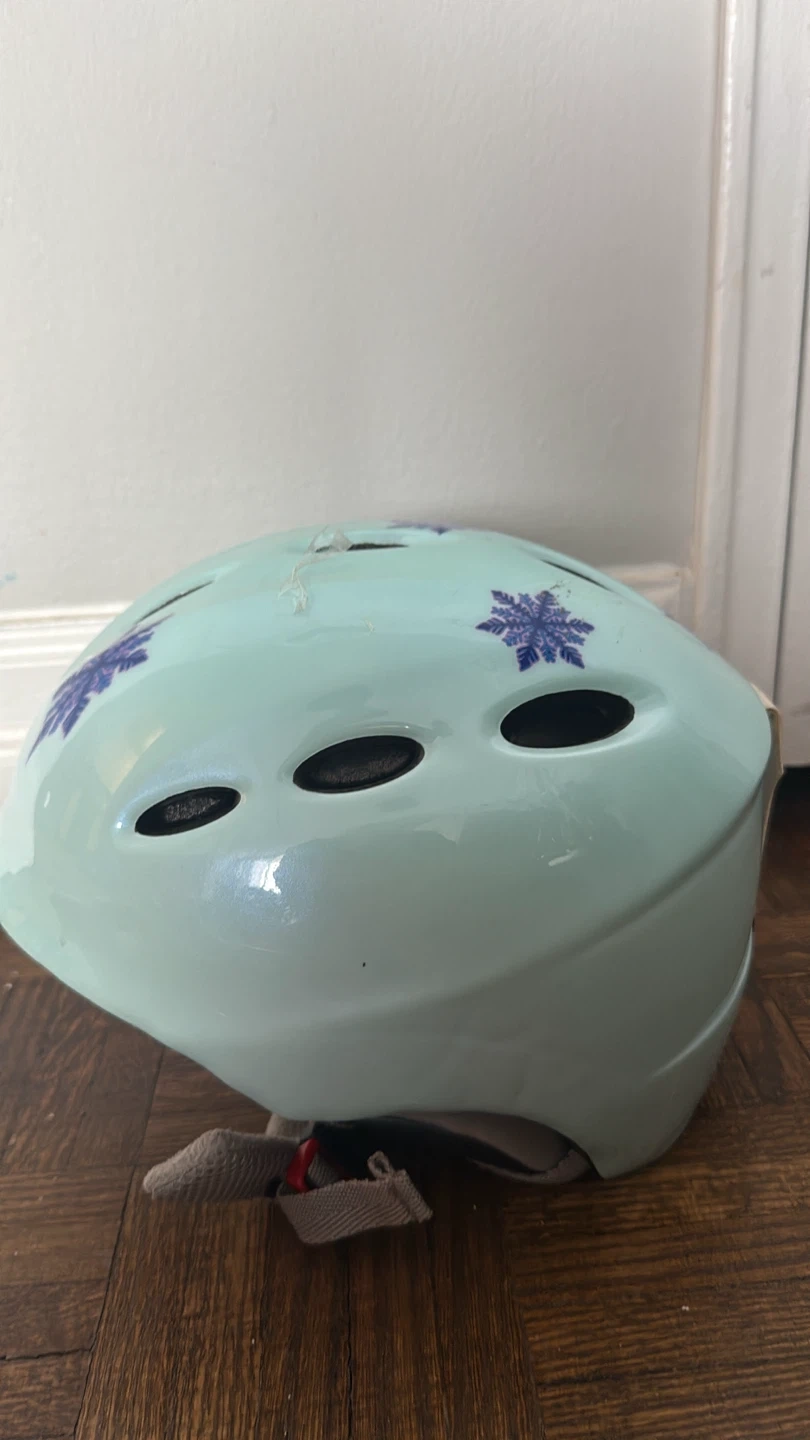 This is a light blue helmet with snowflake decals. It features a soft interior lining for comfort. Adjustable straps ensure a snug fit for various head sizes.