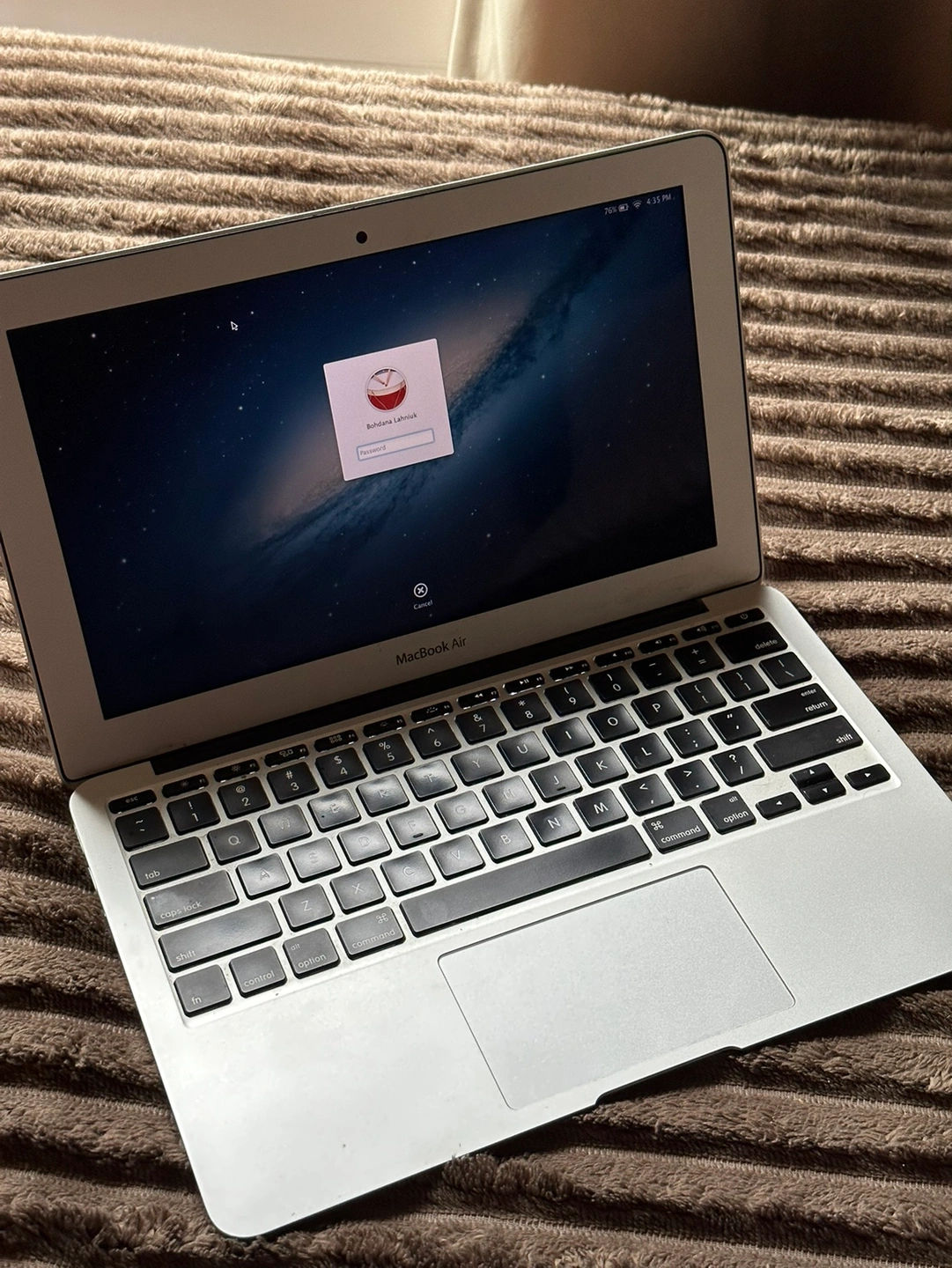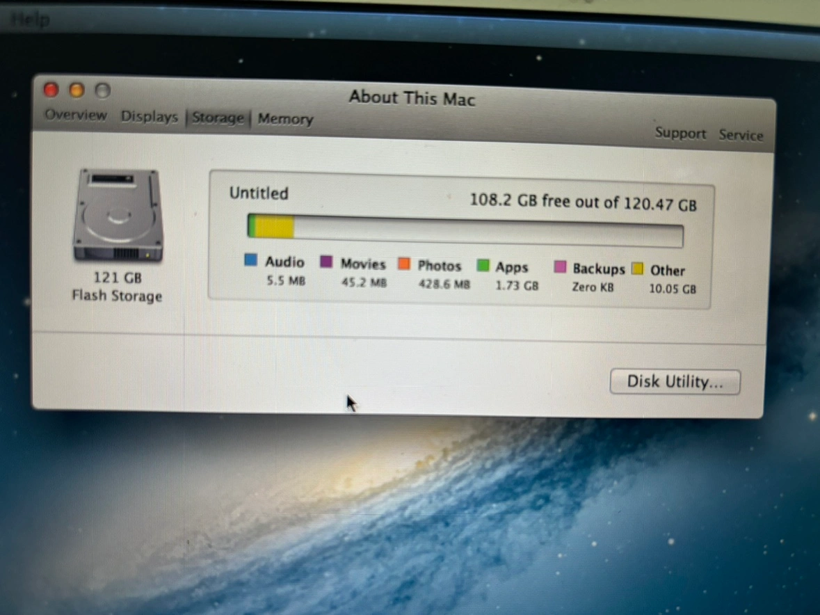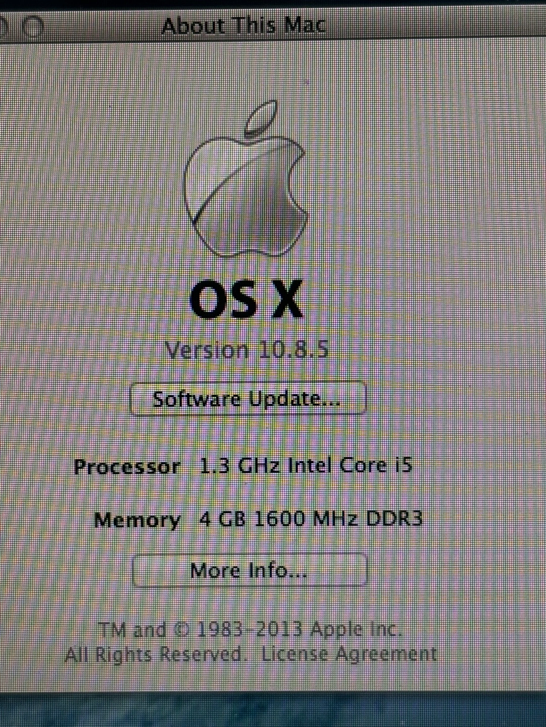 27Macbook Air 13" running OSX 10.8.5 with 1.3 GHz Intel Core i5 processor, 4 GB 1600 MHz DDR3 memory, and 121 GB flash storage.