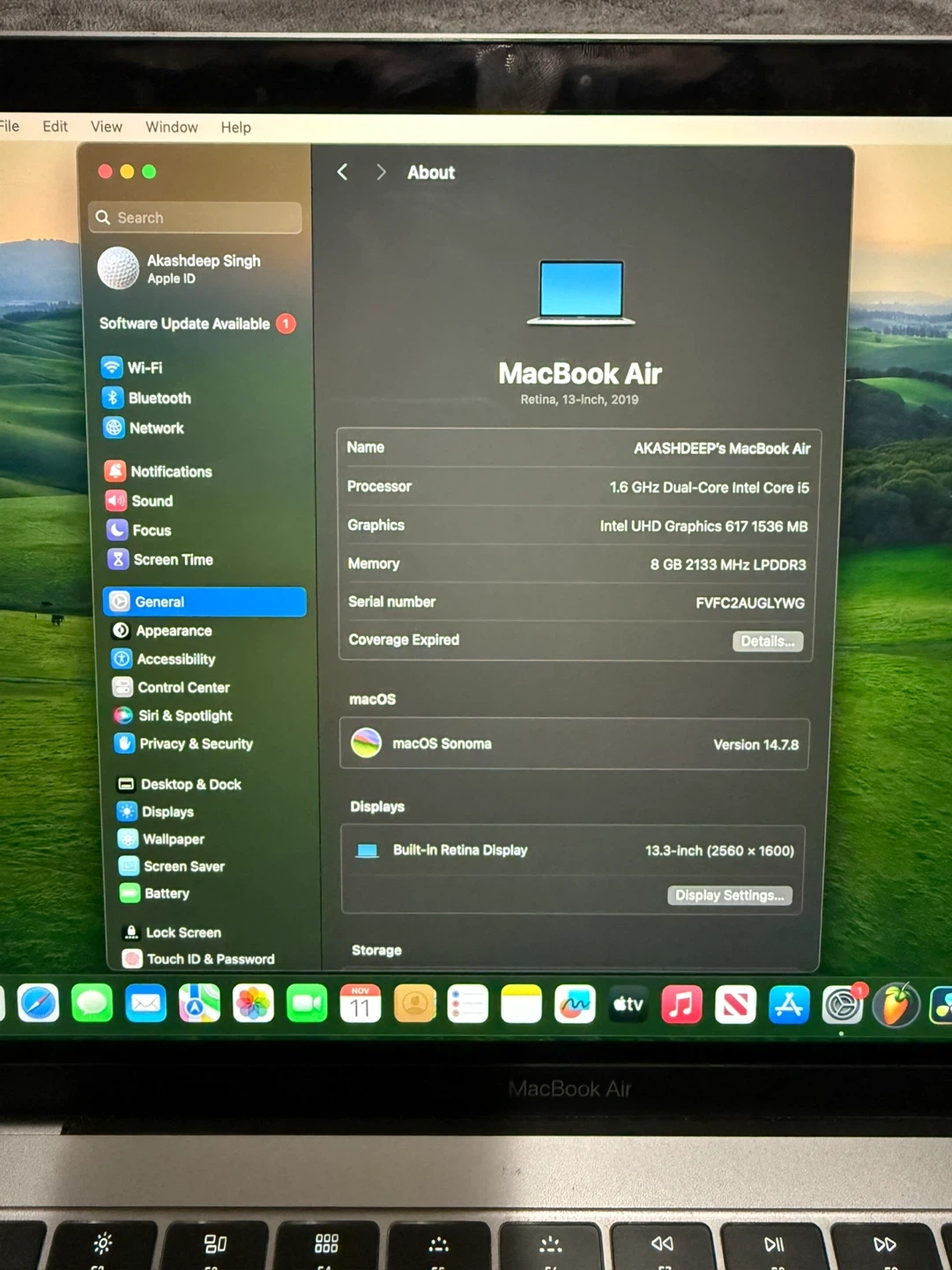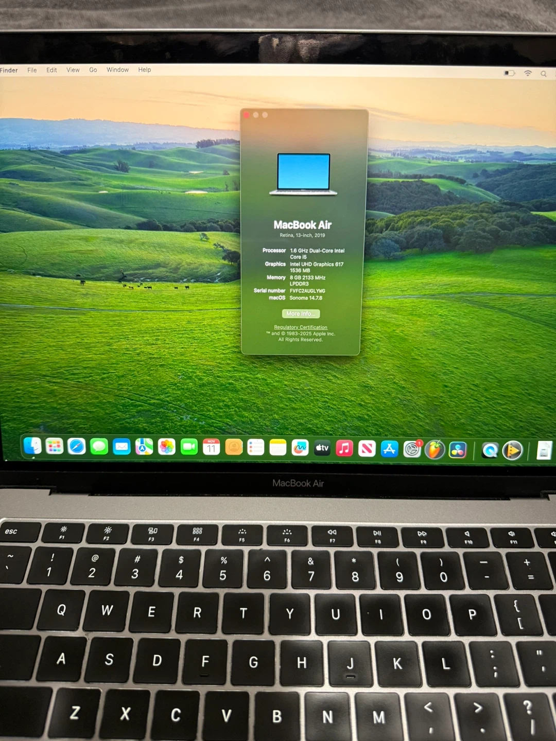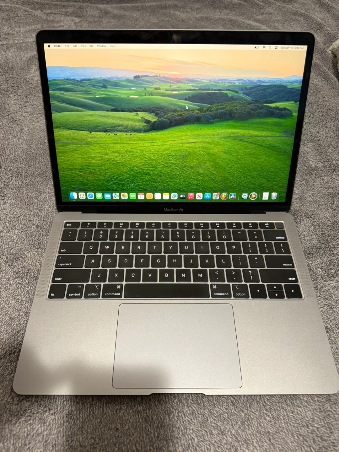 71Selling a MacBook Air 13-inch from 2019. It has a 1.6 GHz Dual-Core Intel Core i5 processor, RAM 8 GB and 128 GB memory, and Intel UHD Graphics 617 1536 MB graphics. Runs macOS Sonoma 14.7.8 Battery health: Normal Fingure print sensor power button Comes with charger and wire only, no box Screen have a minor scuff on outer glass( near second app option on green rectangular box), seen in last photo, no effects on working, barely noticeable. Clean and no dents. Come and check it first. Open to offers.