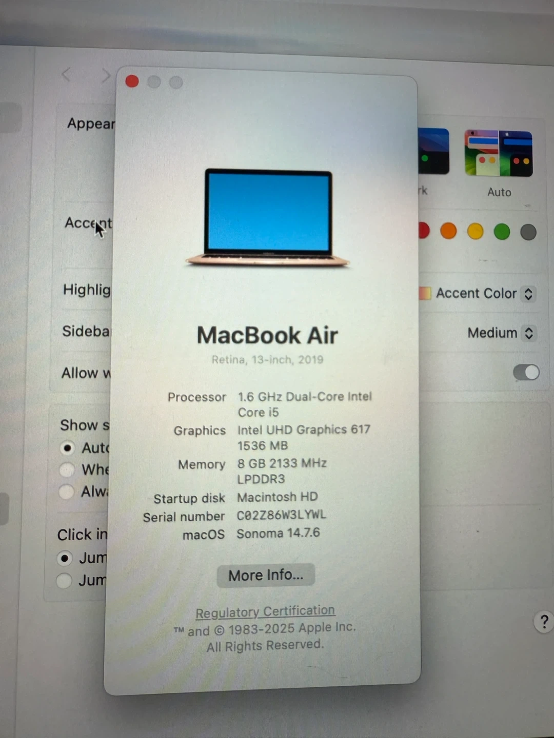 10Selling a MacBook Air, 13-inch model from 2019 in a beautiful rose gold finish! It runs on a 1.6 GHz Dual-Core Intel Core i5 processor with Intel UHD Graphics 617. It has 8 GB of memory and a Macintosh HD startup disk. Perfect for everyday use!