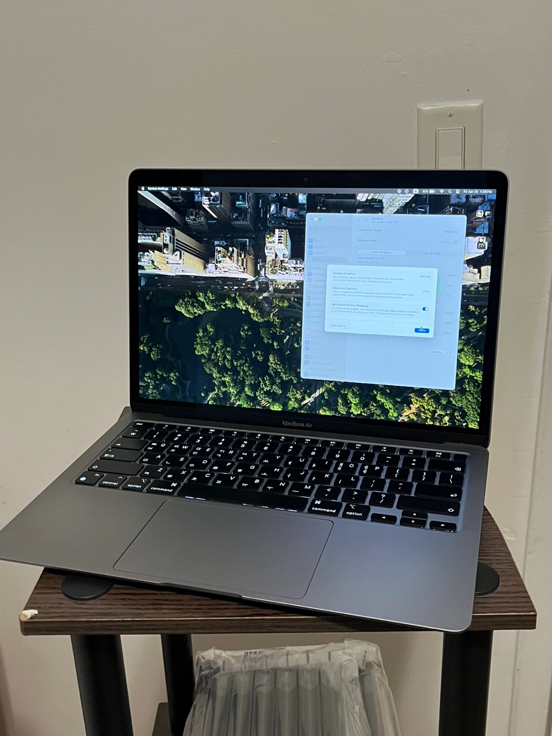 Used MacBook Air used for School. Space grey colour. Includes a brown leather sleeve. Apple M1 chip – fast, and silent 256GB SSD & 8GB RAM - had no issues with university schoolwork or even more like light gaming Battery health at 87% – normal for its age, holds charge well Keyboard layout: Korean (KR) – same as US layout functionally; just has additional Korean characters printed on the keys. Works exactly like a regular English US keyboard. Condition – minor dents no big damage, always used with care Includes – original Apple 30W USB-C charger and cable Laptop is wiped and ready to go!