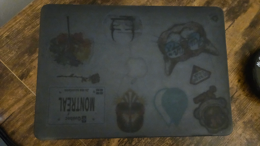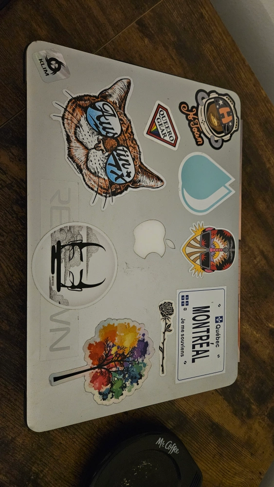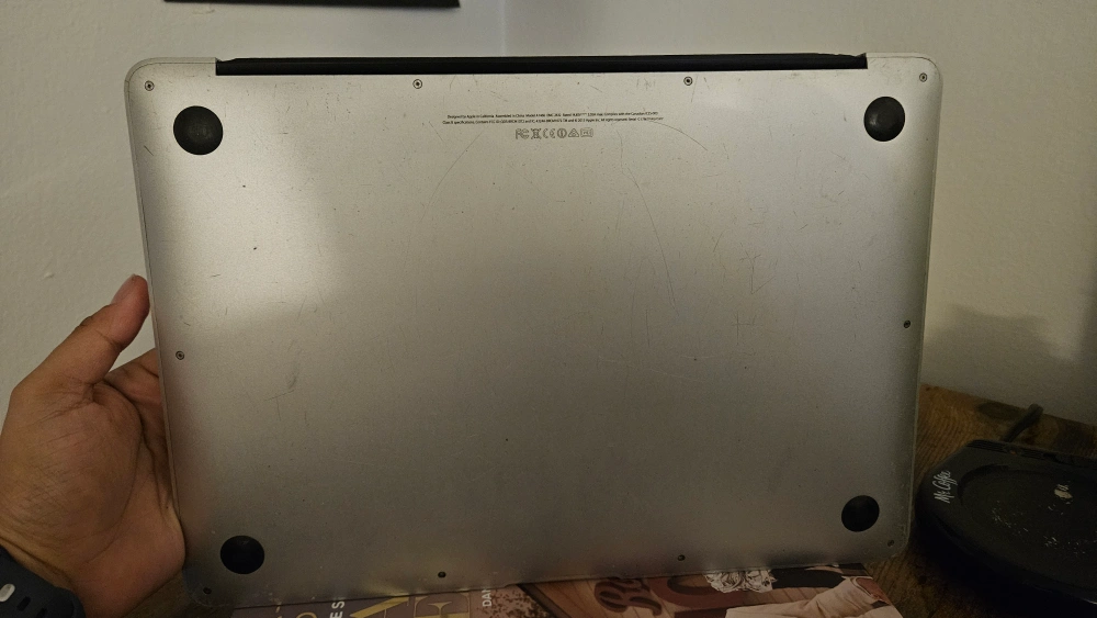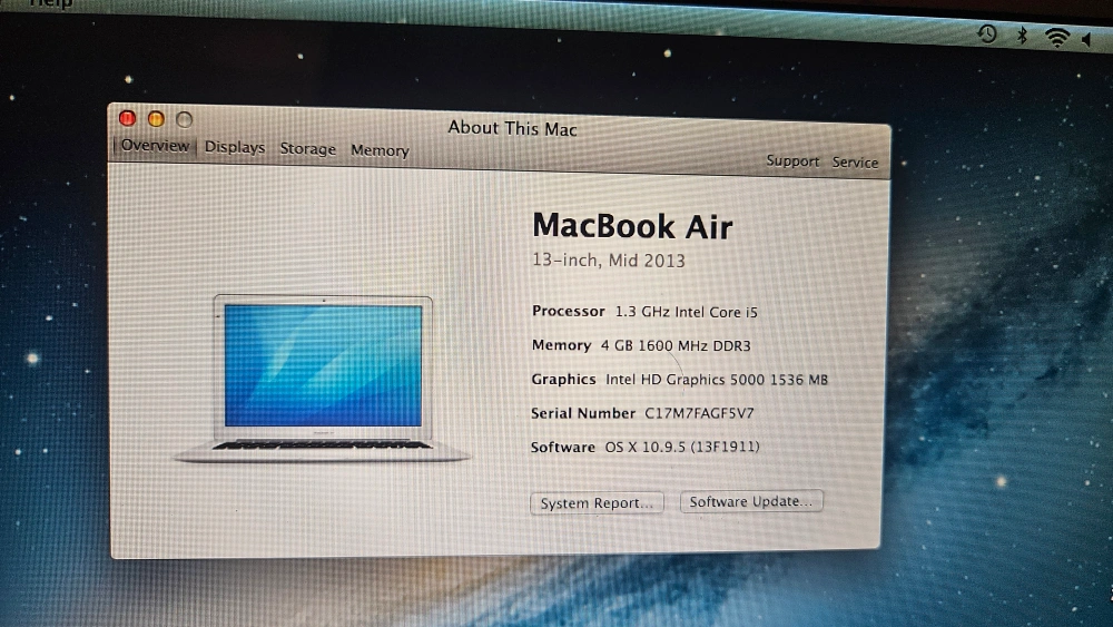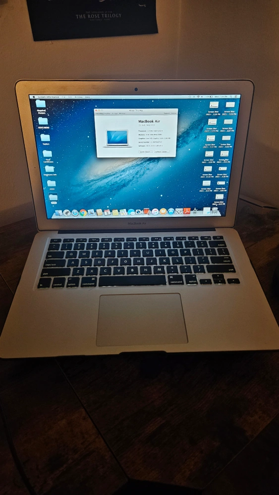 81Used MacBook Air. 13-inch screen. Intel Core i5 processor. 4 GB RAM. Intel HD Graphics 5000. OS X 10.9.5. Several stickers on the lid. Some wear and tear.