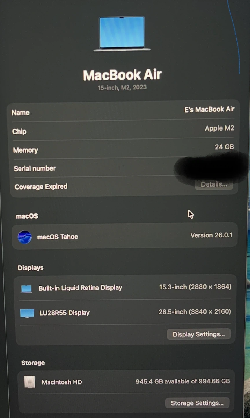 10Selling a MacBook Air 15-inch with the M2 chip. It has 24 GB of memory and a 994.66 GB Macintosh HD. The built-in Liquid Retina display is 15.3-inch (2880 x 1864). Comes with original box and charger.