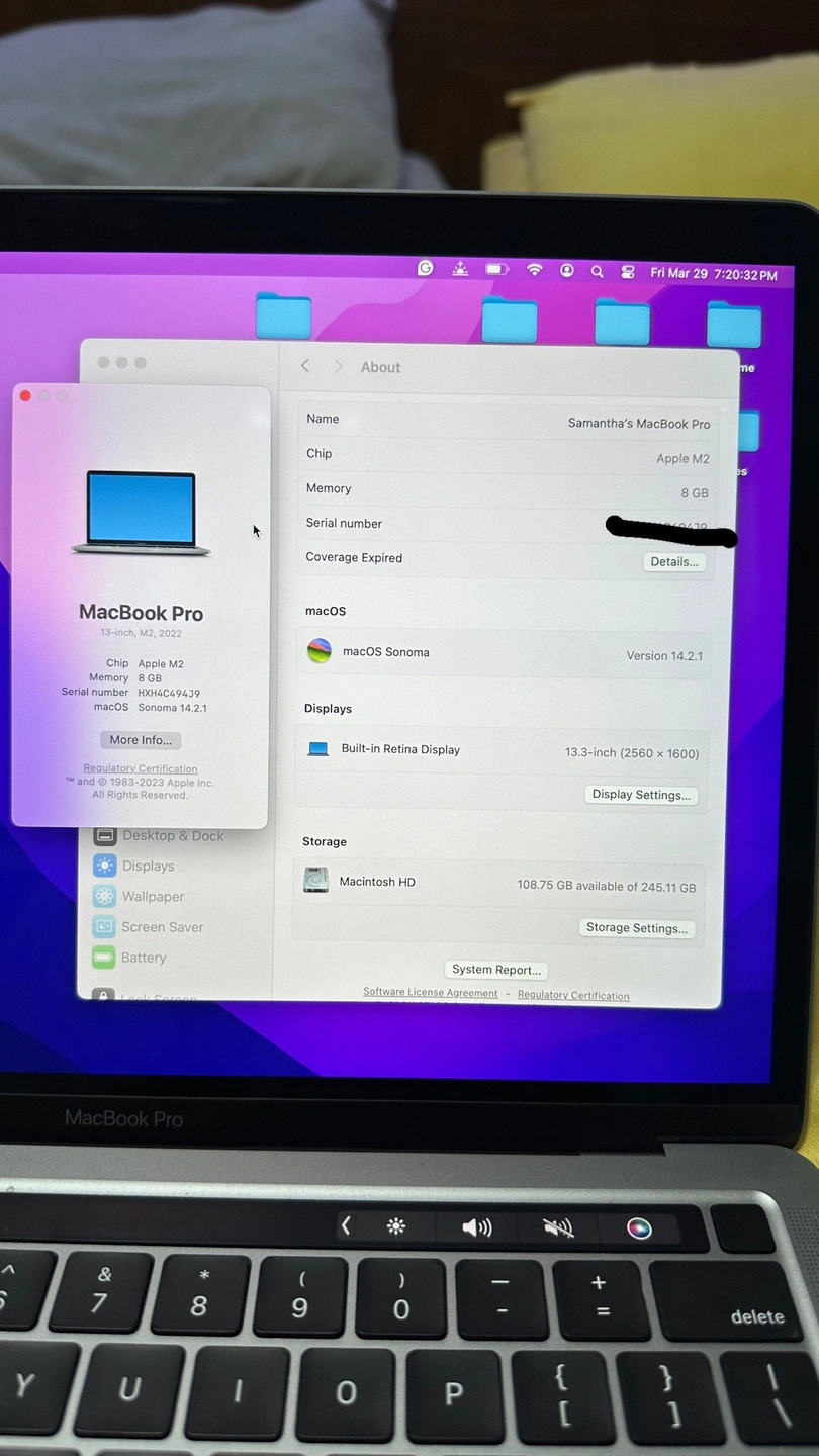 MacBook Pro(13,3-inch,M2,2022), 8GB RAM, 256GB,Touch Bar, Battery Condition: Normal Battery Maximum Capacity: 95% Purchased : January 2022. Perfect condition Comes with original charger and box