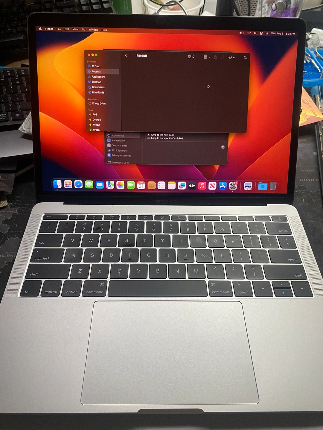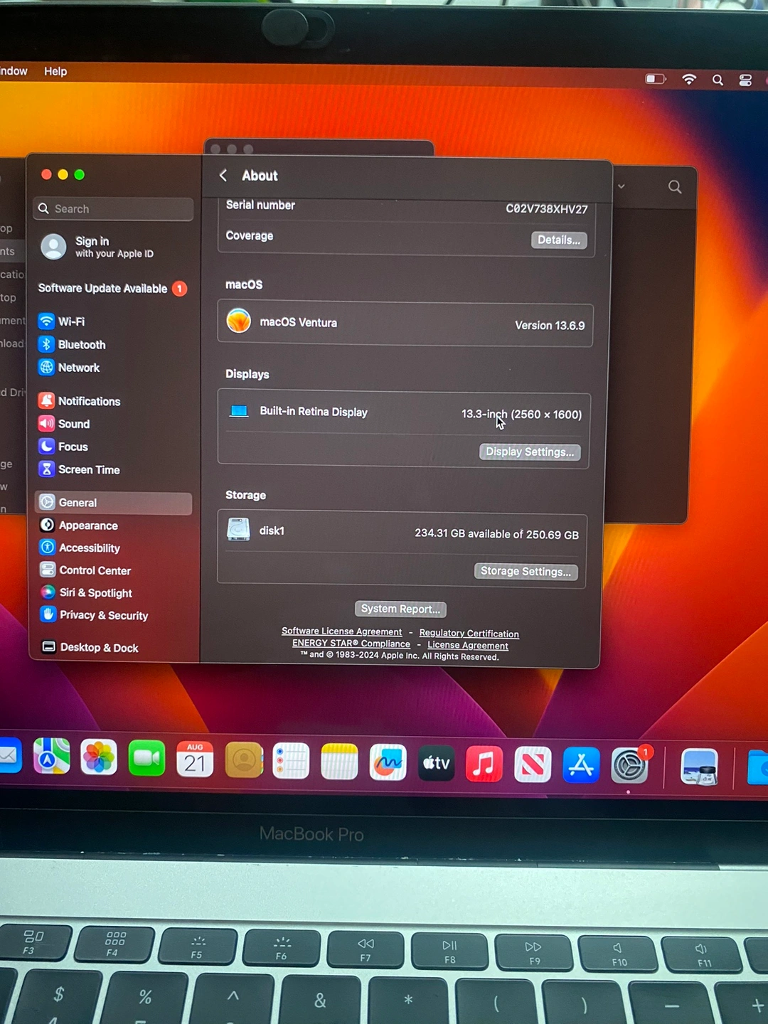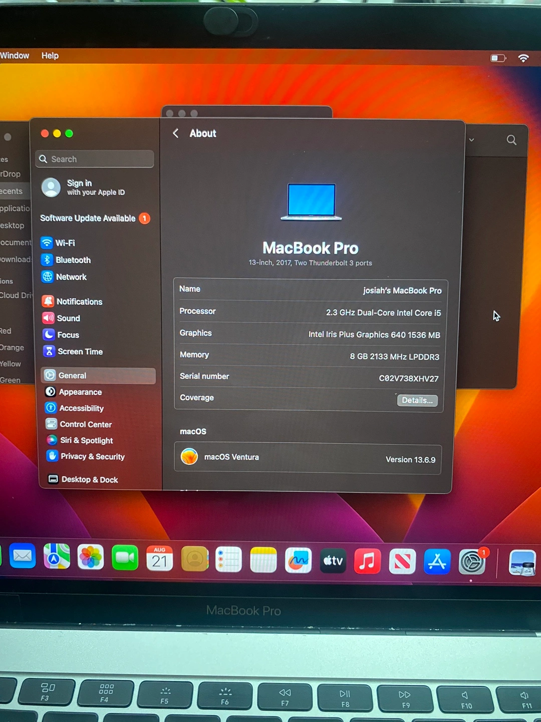 MacBook Pro 13-inch 2017 with 8GB RAM and a 2.3GHz Dual-Core Intel i5 Processor. It comes with a 256GB hard drive, Intel Iris Plus Graphics 640 1536 MB. The laptop is running macOS Ventura 13.6.9. The serial number is C92V73BM1V27.