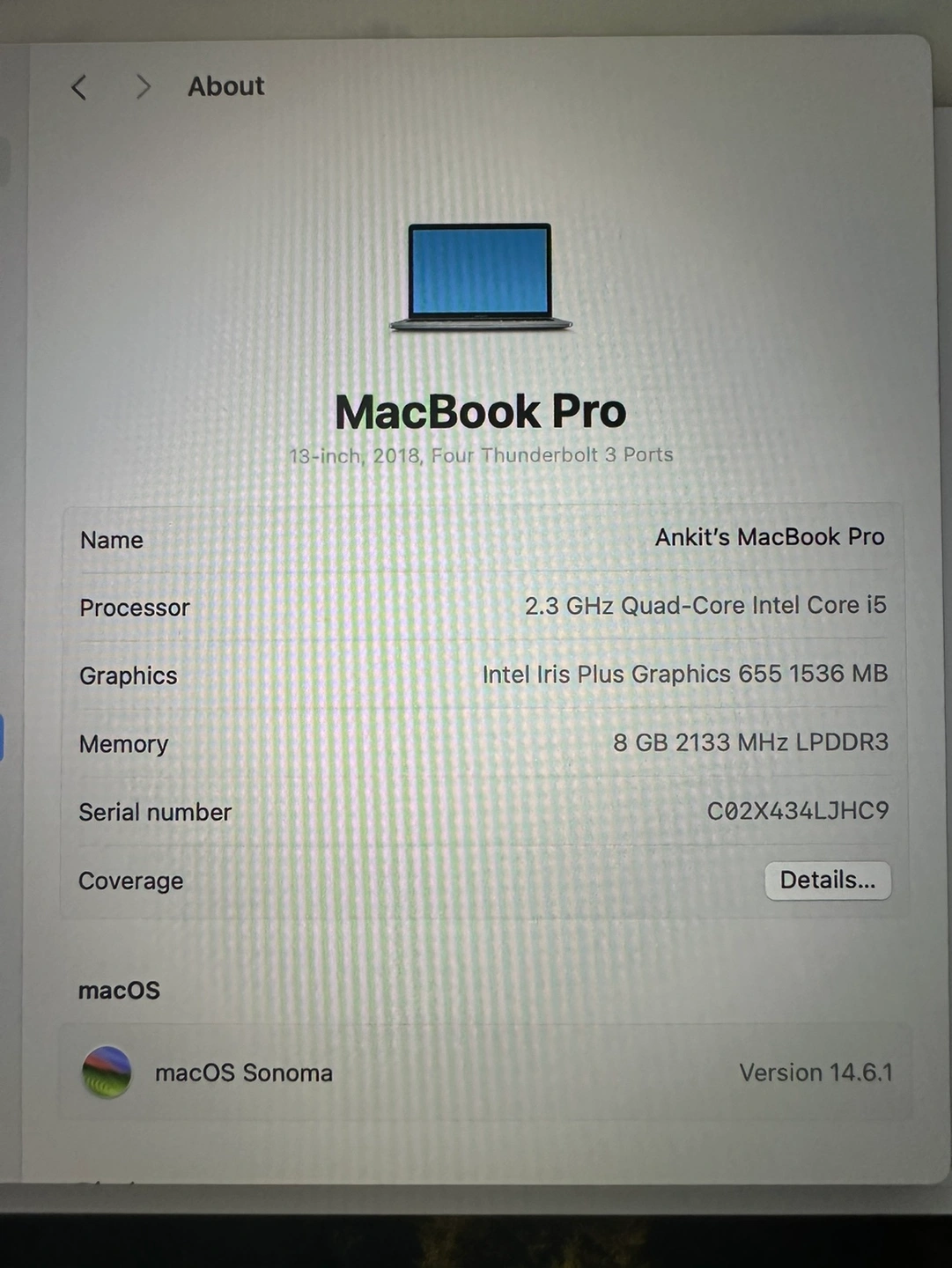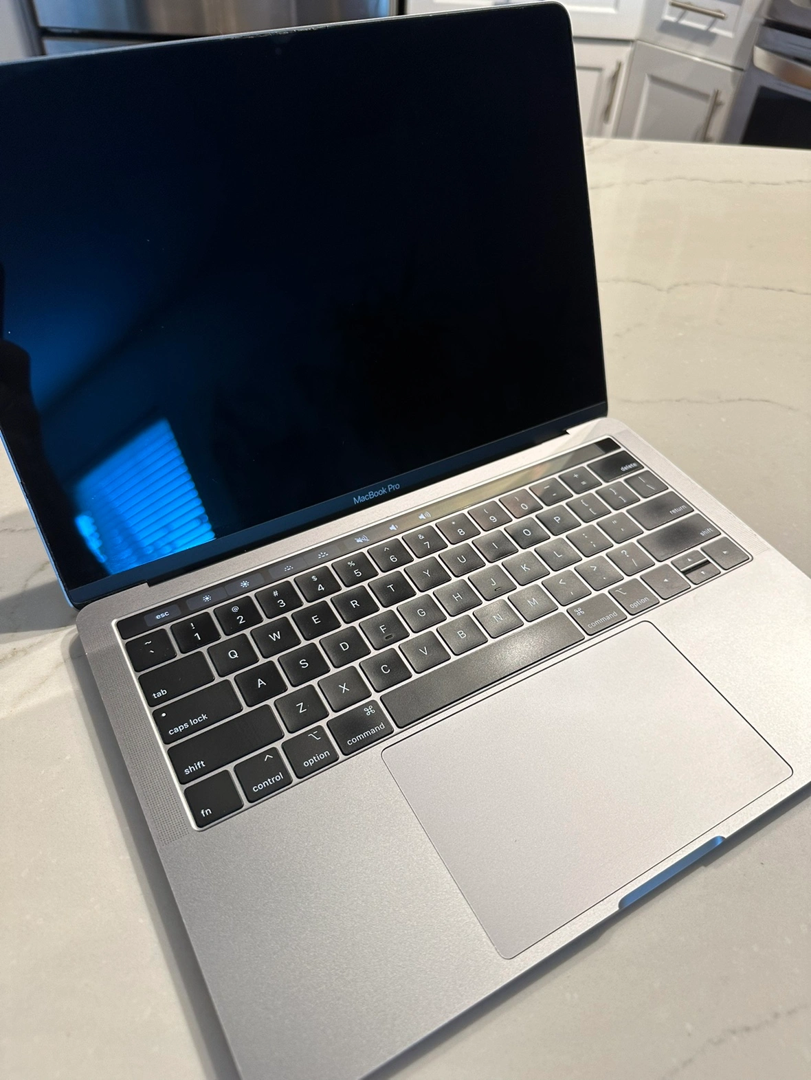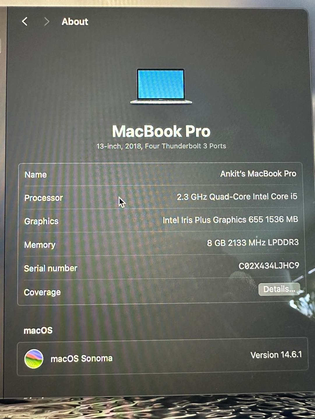 MacBook Pro 13-inch (2018) with Intel Core i5 processor, Intel Iris Plus Graphics 655 1536 MB, 8 GB RAM, and macOS Sonoma. Includes four Thunderbolt 3 ports and charger. Very well maintained. Battery in good health.
