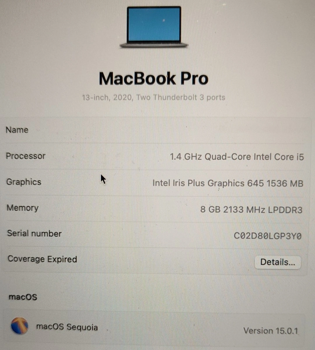 1.4 GHz Quad-Core Intel Core i5, 8 GB RAM, Intel Iris Plus Graphics 645, Two Thunderbolt 3 ports, macOS Sequoia 15.0.1