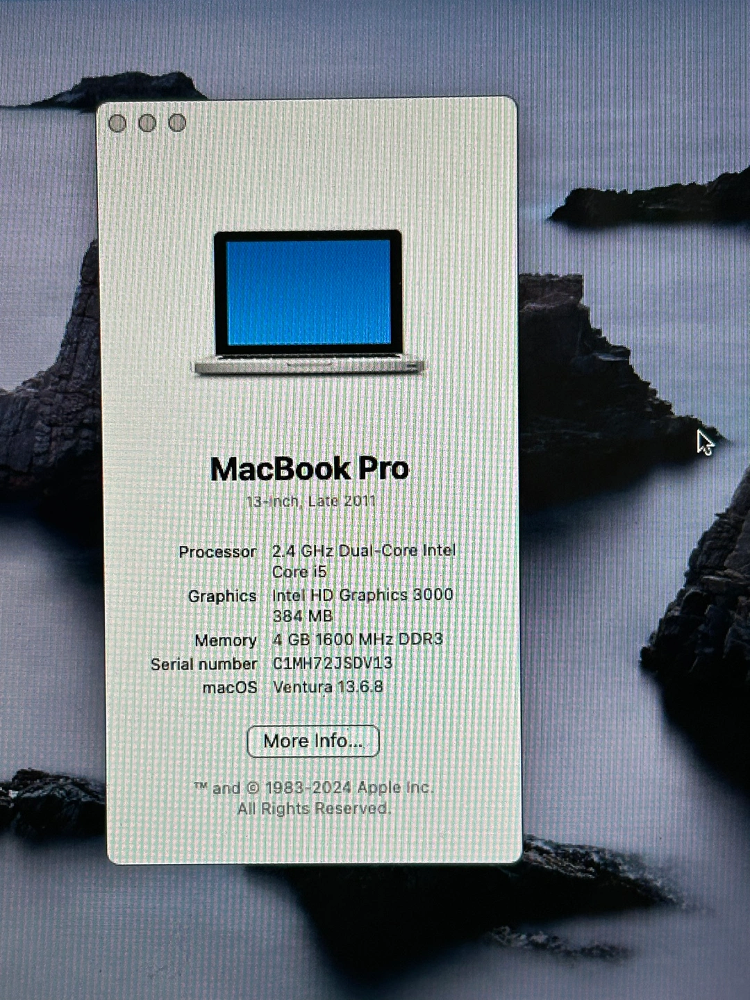 This is a MacBook Pro 13-inch, Late 2011. RUNNING OS VENTURE It has a 2.4 GHz Dual-Core Intel Core i5 processor, Intel HD Graphics 3000 graphics, 4 GB 1600 MHz DDR3 memory, and a 500 GB hard drive. It is running macOS Ventura 13.6.8. The laptop is in good condition and has been well-maintained. It comes with a charger and is ready to use.