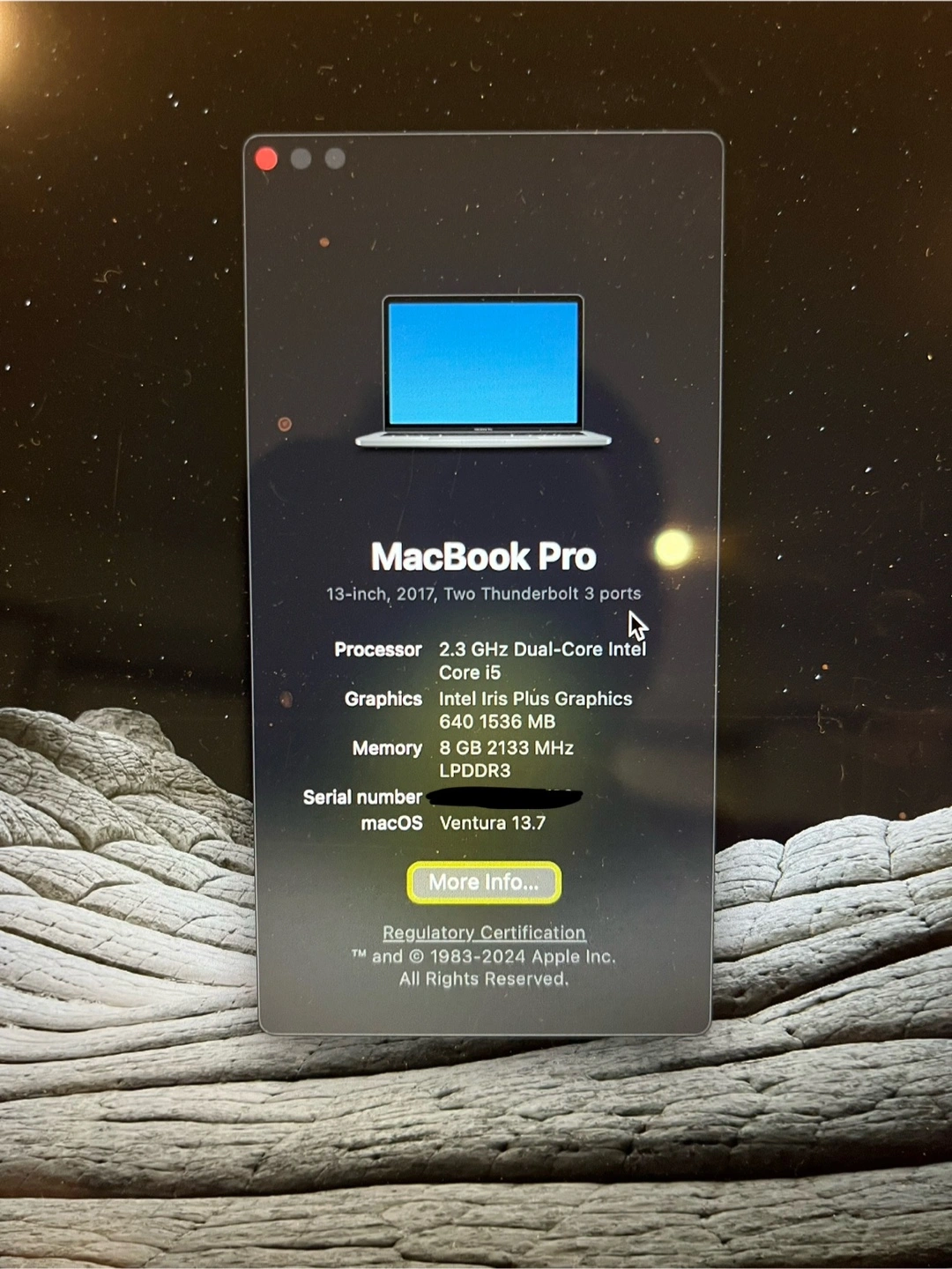 12Selling my MacBook Pro 13” (Mid 2017) - excellent in physical condition, clean, scratch-free body - 10/10 - well taken care of - never had any issues other than having battery replaced once in 2022 - specs: 2.3GHz i5, 8GB RAM, 256GB SSD - include original charger - battery is in service recommended, but haven't got any strong issues so far (price reflected this condition) Price: $300 (open for reasonable offers) Location: Toronto Pickup preferred. Local buyers only. Feel free to reach out for questions or more photos!