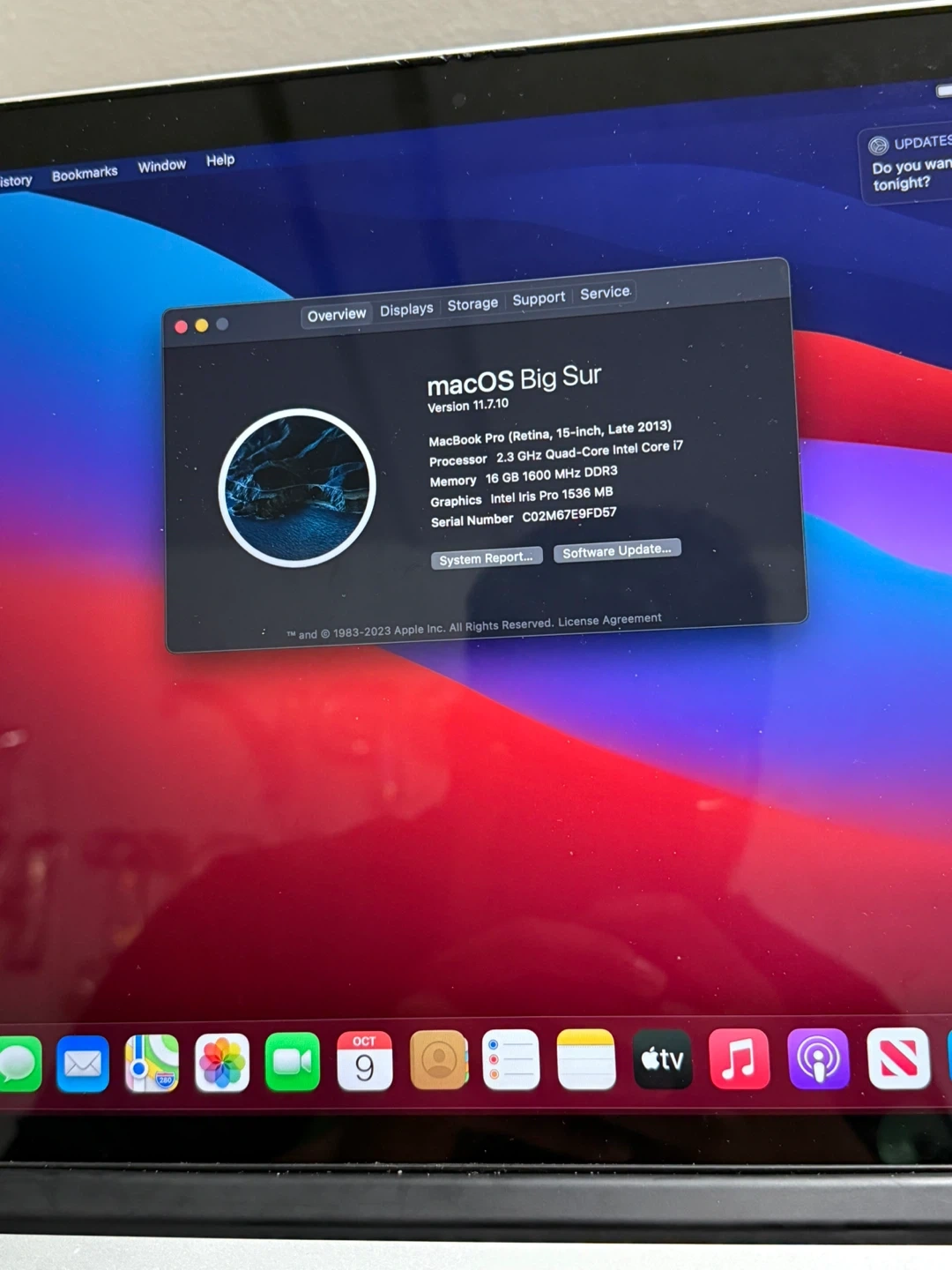 75Selling my MacBook Pro (Retina, 15-inch, Late 2013). It has a 2.3 GHz Quad-Core Intel Core i7 processor and 16 GB 1600 MHz DDR3 memory. The graphics card is an Intel Iris Pro 1536 MB. Great for everyday use! Comes with original charger Used only for a 3-4 times
