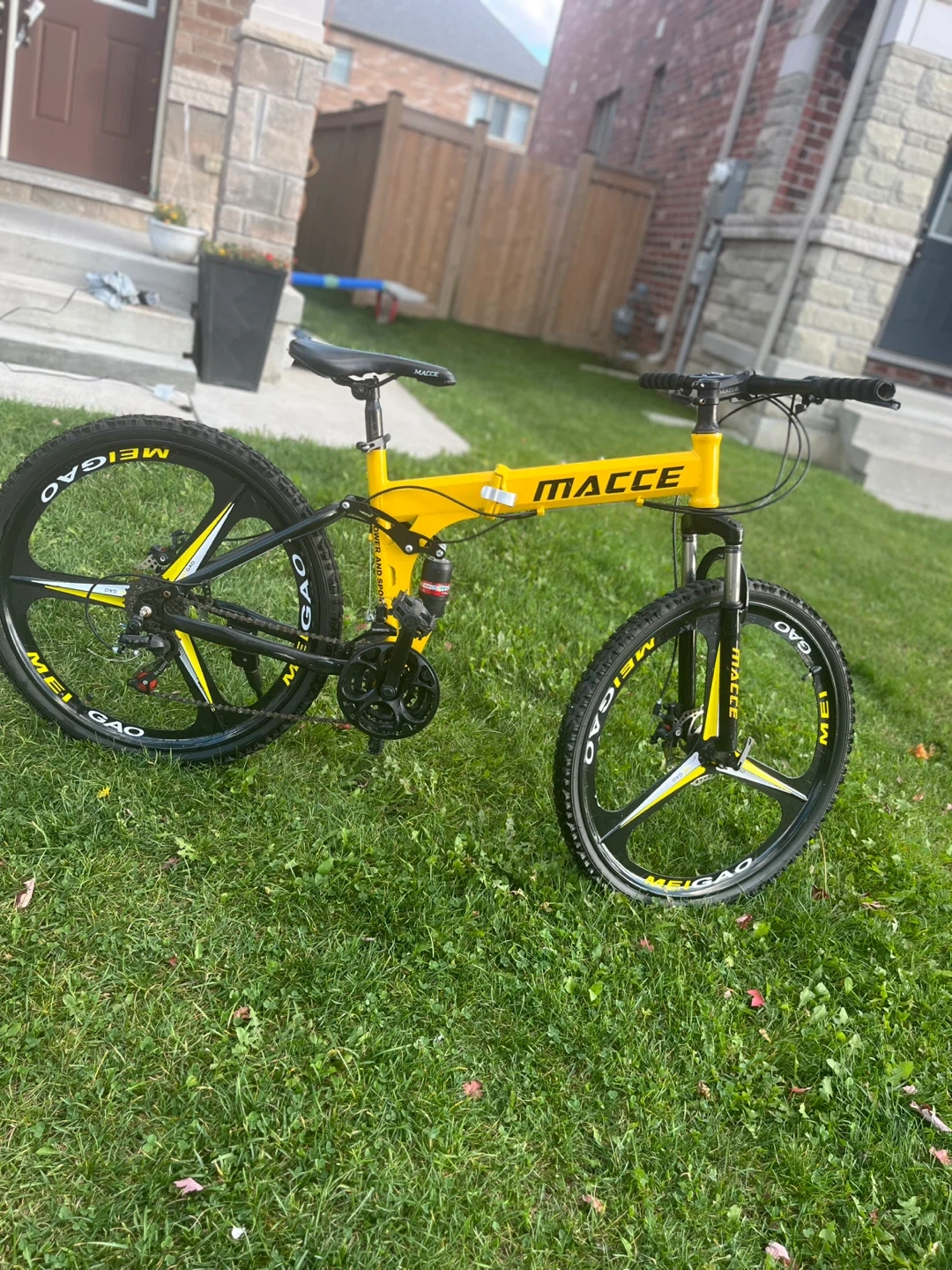 10Selling a MACCE folding mountain bike in a vibrant yellow and black colour scheme. This bike is perfect for those who need a portable and storable option. The folding design allows for easy transport and storage, making it ideal for city dwellers or anyone with limited space. The mountain bike features make it suitable for various terrains, offering a versatile riding experience. It's in good condition and ready for a new owner to enjoy and has been sitting in the garage with minimal scratches