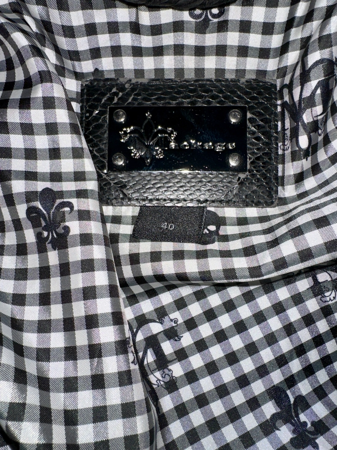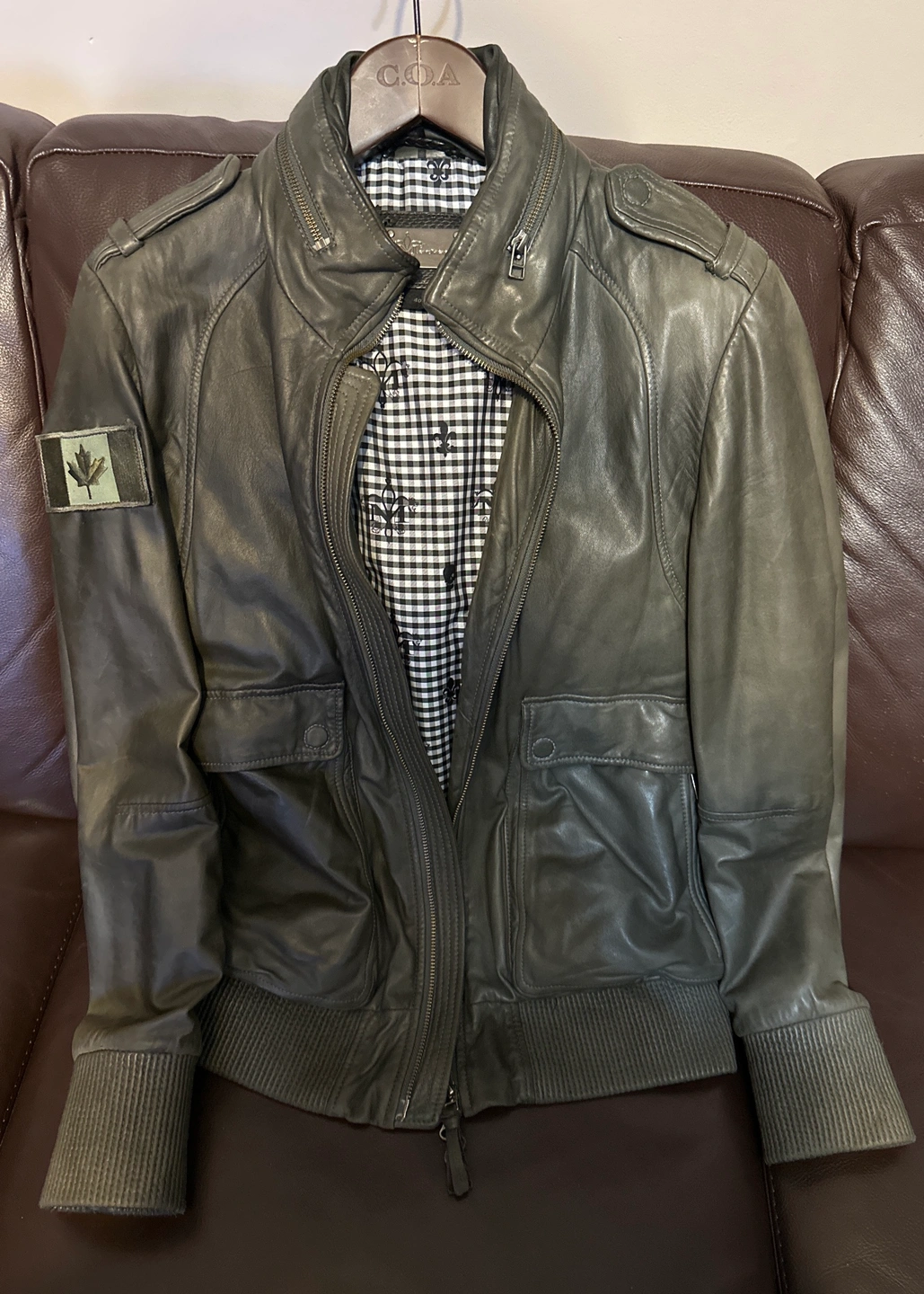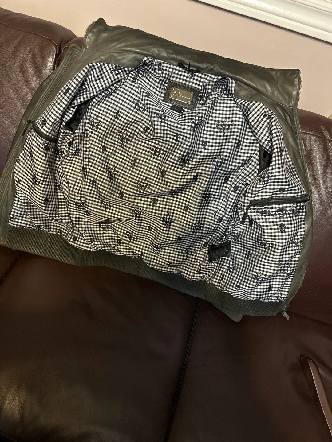 A men's soft lambskin leather jacket with a zipper closure. It has two flap pockets, a zippered pocket, and ribbed cuffs and hem. There is a Canadian flag patch on the left sleeve. It has a checkered lining and a Mackage brand label on the inside. Hidden waterproof hood in the zippered collar . The maple leaf on the back is hiding a small tear. The jacket retailed for $999.00 plus taxes 7-8 years ago .