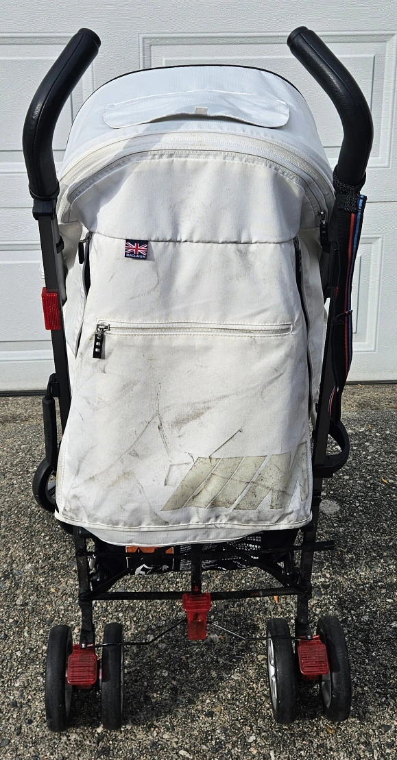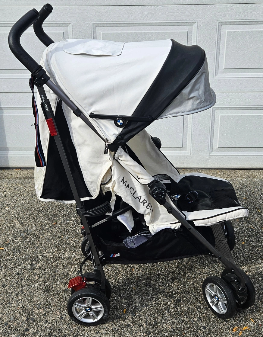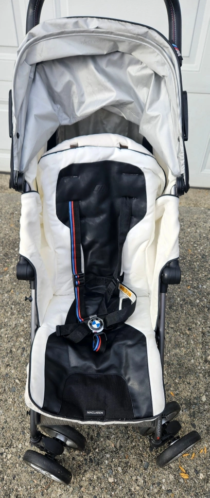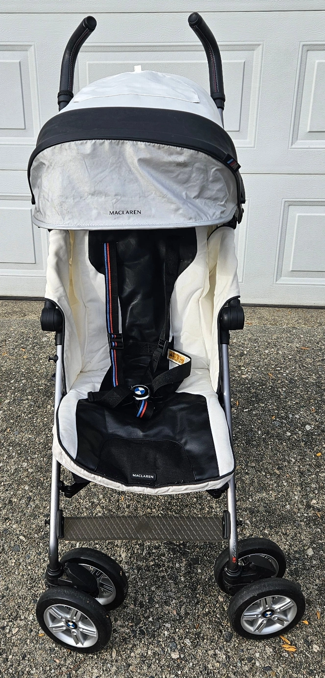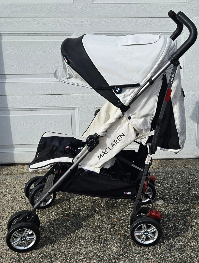Maclaren BMW M Techno XT White This Maclaren BMW Stroller is in excellent functioning cond. unfortunately this Maclaren BMW Stroller does need a good cleaning. The fabric need cleaning but all straps and harnesses are in excellent working order. Features: The best engineers do not work within the constraint of what is possible. Instead, they think in terms of what is best. It is this atmosphere which gave rise to the BMW M Buggy from Maclaren. The BMW M Buggy features an automotive-inspired contoured seat with signature M stripe harness, BMW-inspired wheel design and luxurious leather handles. This Techno XT stroller includes an assortment of coordinating accessories. Every Maclaren stroller is eligible to receive the benefits of our Sovereign™ Basic Weight 6.8kg Carry Handle Leather Handles Heat Reflective Basket Recline Seat with One-Hand Adjustment Buggy ID Tag (included) Compatible with Universal Carrycot Built-in Newborn Safety System™ Built-in Storage Pocket Extendable Leg Rest Headhugger & Shoulder Pads Viewing Window on Hood