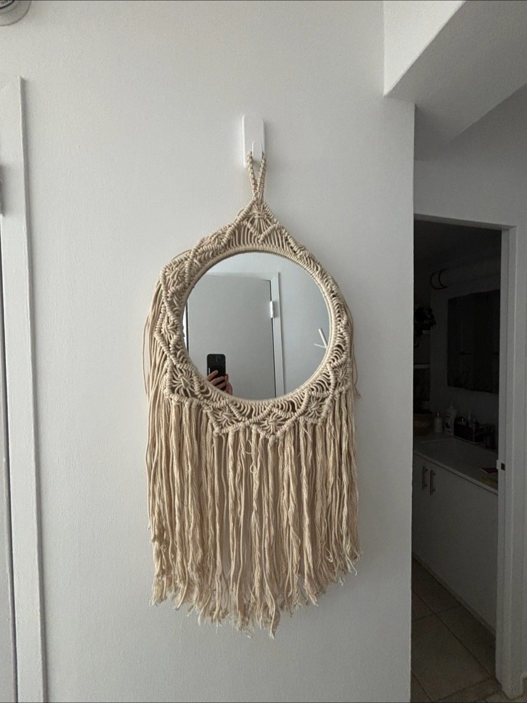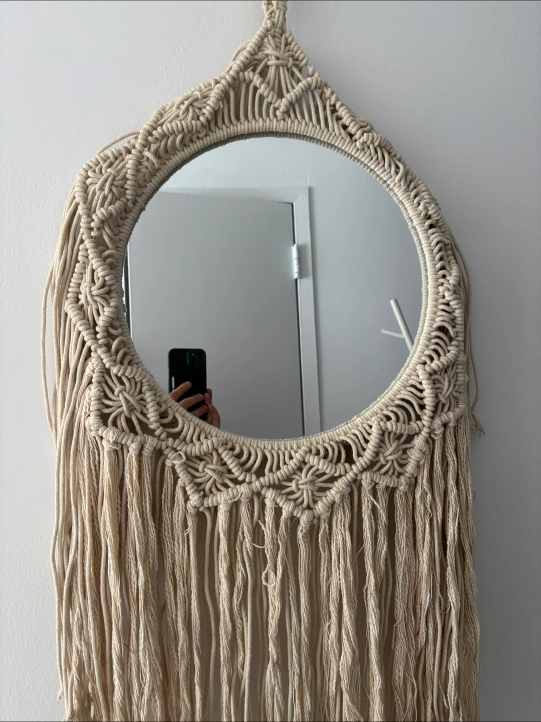 Add a touch of boho charm to your space with this lovely macrame wall mirror! It's a beautiful piece of decor that would look great in any room. please see pics for measurements. Approximately 7 lbs.
