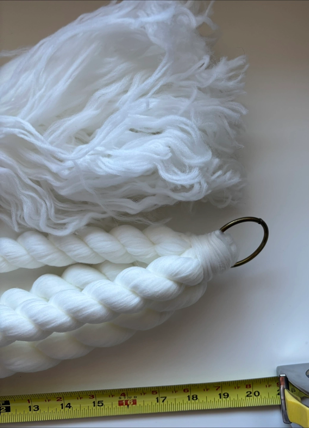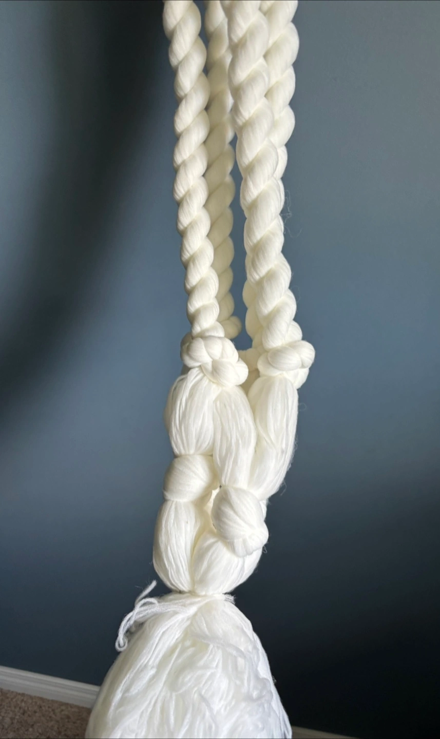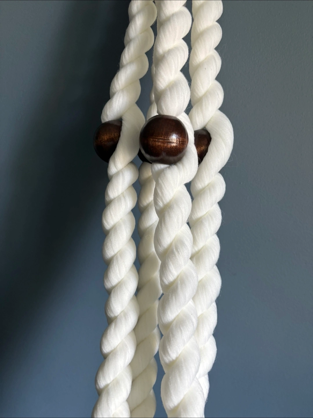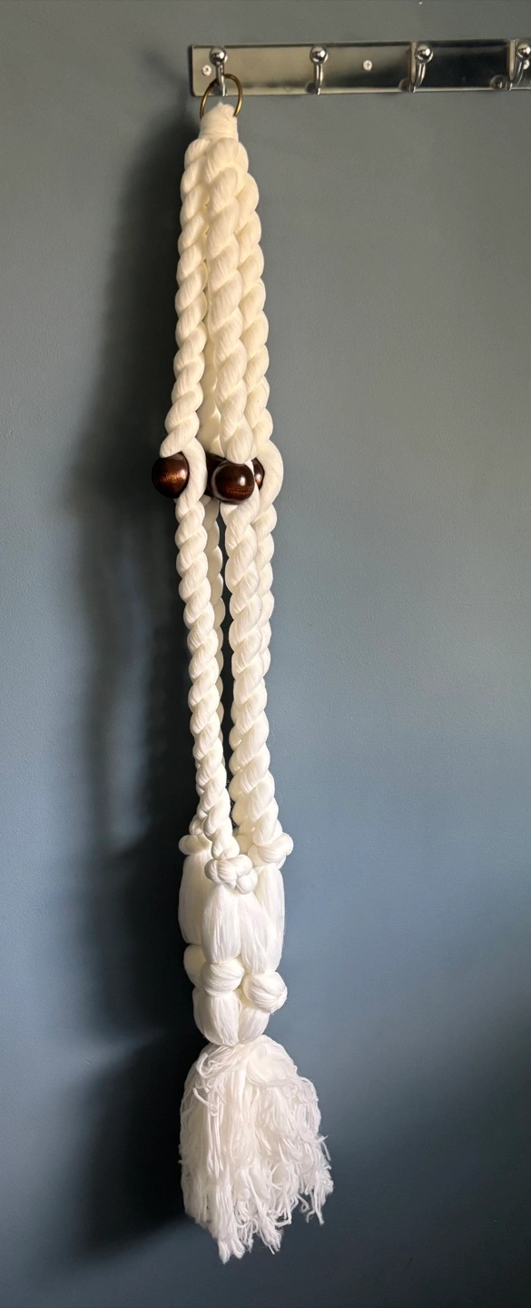 Add a touch of boho charm to your home with this macrame plant hanger! It's in great condition and ready to display your favourite plants. The hanger features a braided design with wooden beads and a tassel at the bottom. It measures approximately 18 inches in length.