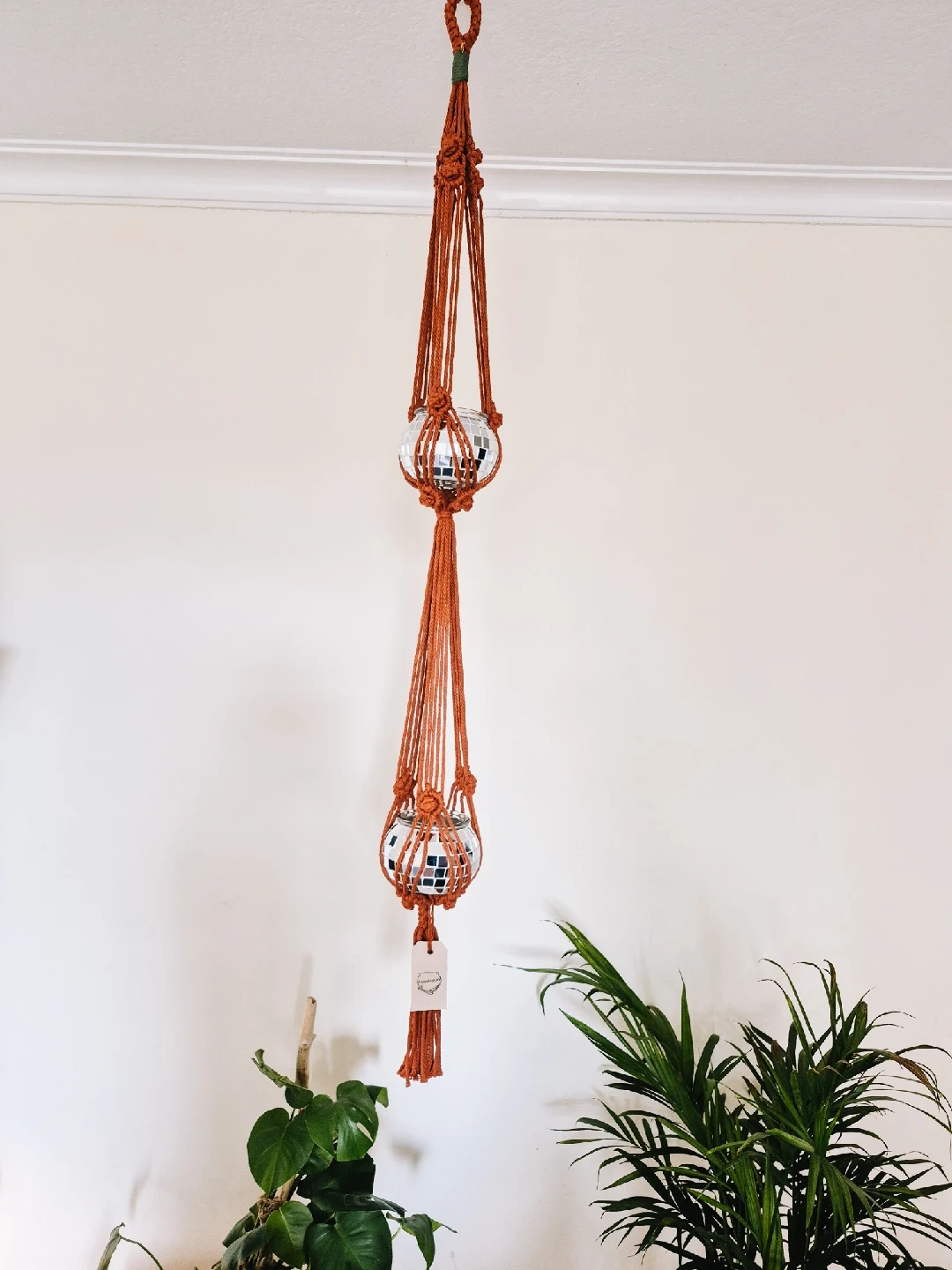 Add a touch of groovy flair to your plants with this macrame plant hanger! It features a cute disco ball detail that catches the light beautifully. The macrame is a warm, earthy orange colour. Perfect for adding a bit of fun to your indoor garden