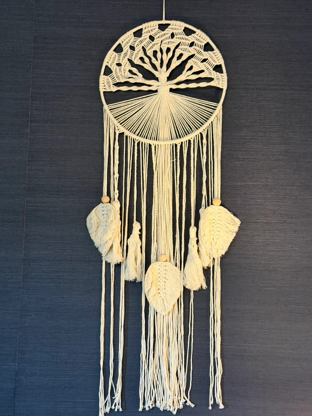 146Add a touch of bohemian charm to your space with this beautiful macrame wall hanging! The intricate tree of life design and delicate details make it a unique and eye-catching piece of decor. Perfect for adding texture and warmth to any room! Diameter size: 11.8 inch and total length: 37.8inch