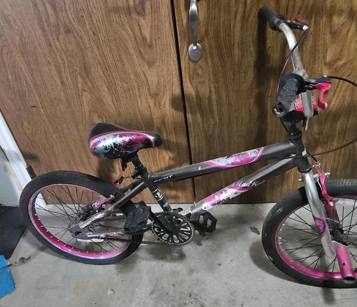 Girl's Mad Gear bike in good condition. It has a cool pink and silver design. Perfect for learning to ride!