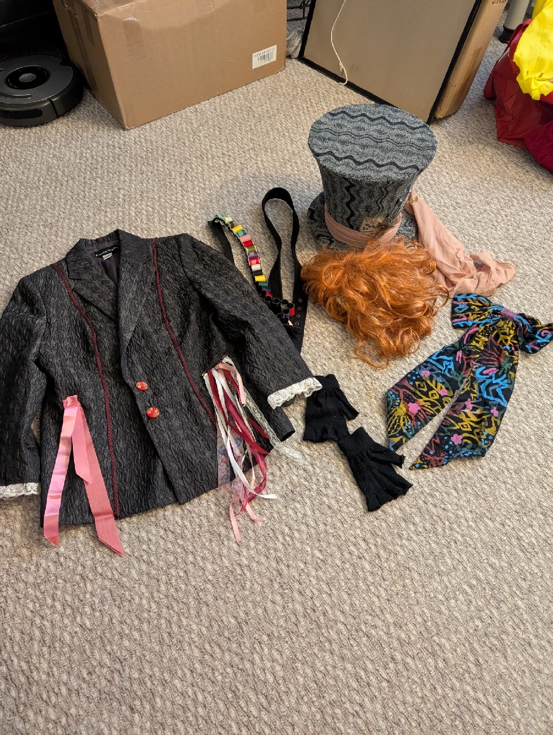 99Handmade hat, tie, arsenal of thread belt, sash alterations to jacket size 12, were handmade as well Selling a complete Mad Hatter costume! Includes the jacket, hat, wig, and other accessories to complete the look. Perfect for Halloween or costume parties!
