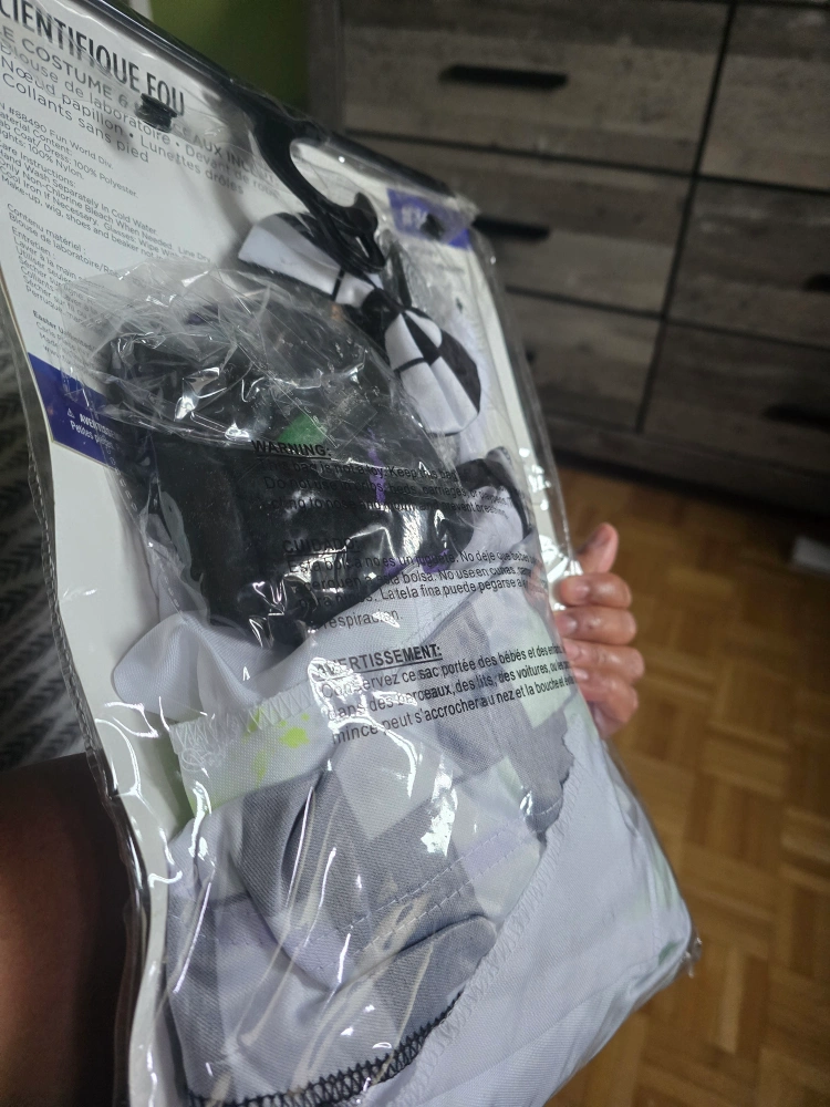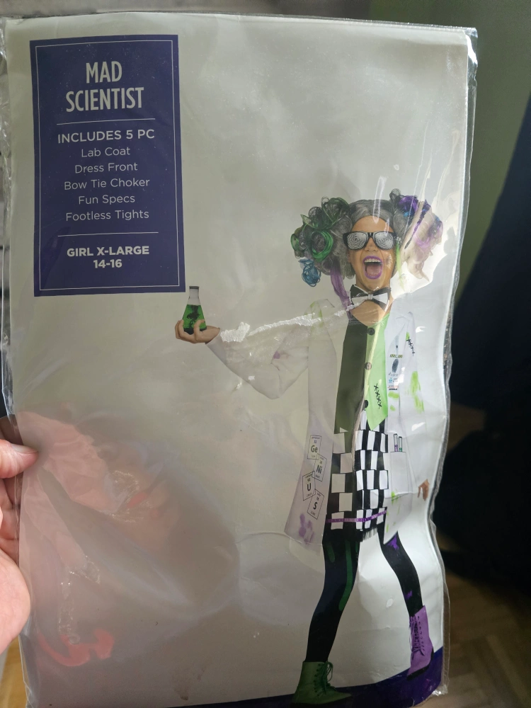 Selling a brand new Mad Scientist costume for girls, size X-Large (14-16)! It includes 5 pieces: a lab coat, dress front, bow tie choker, fun specs, and footless tights. Perfect for Halloween or dress-up!