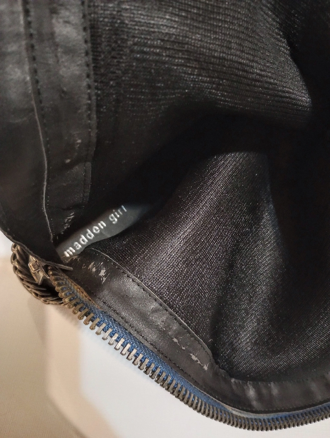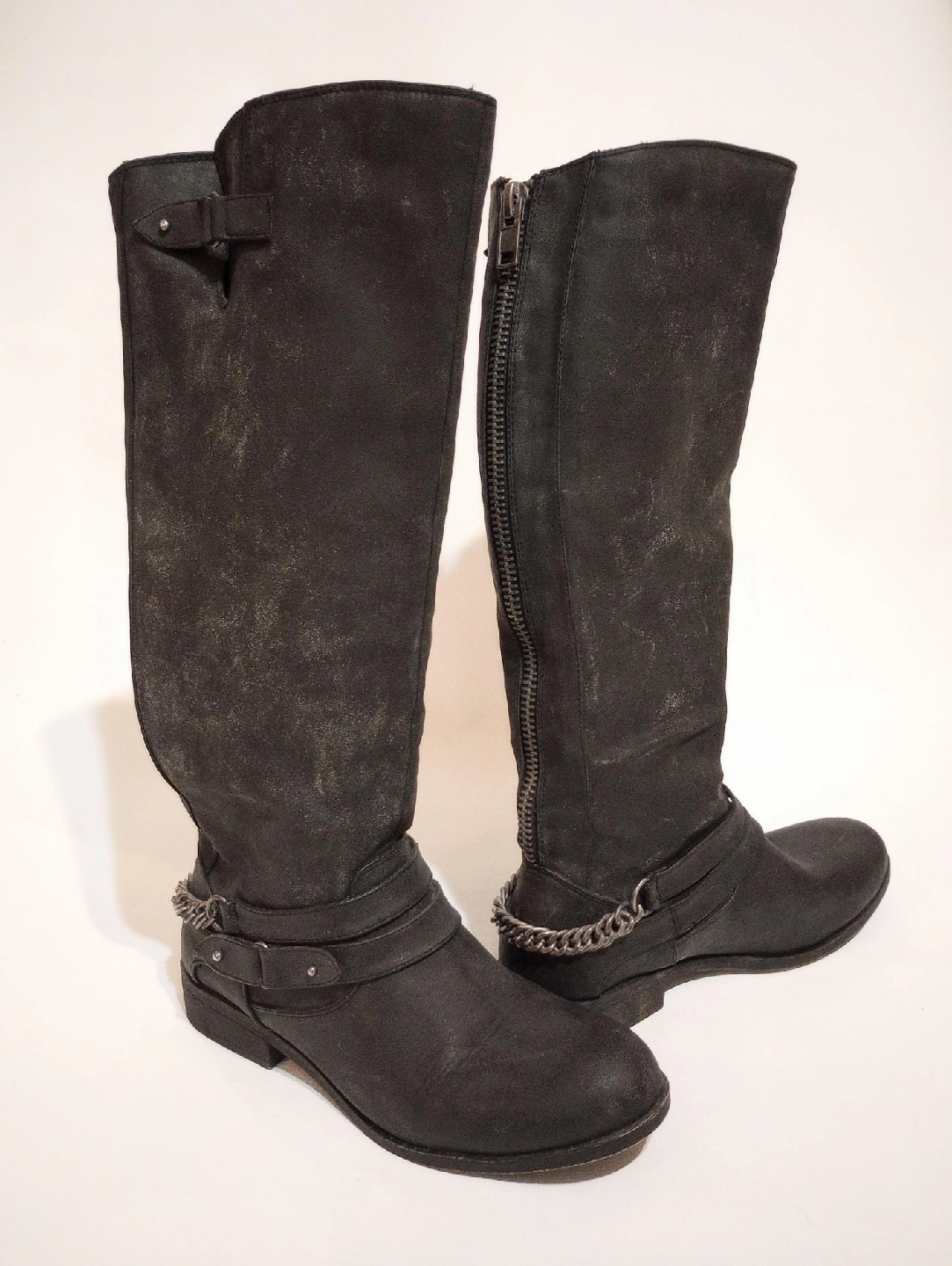 10Madden Girl knee-high, zip-up riding boots featuring chain and buckle detail. Dark grey/black color. Open to trade offers for same-size shoe.