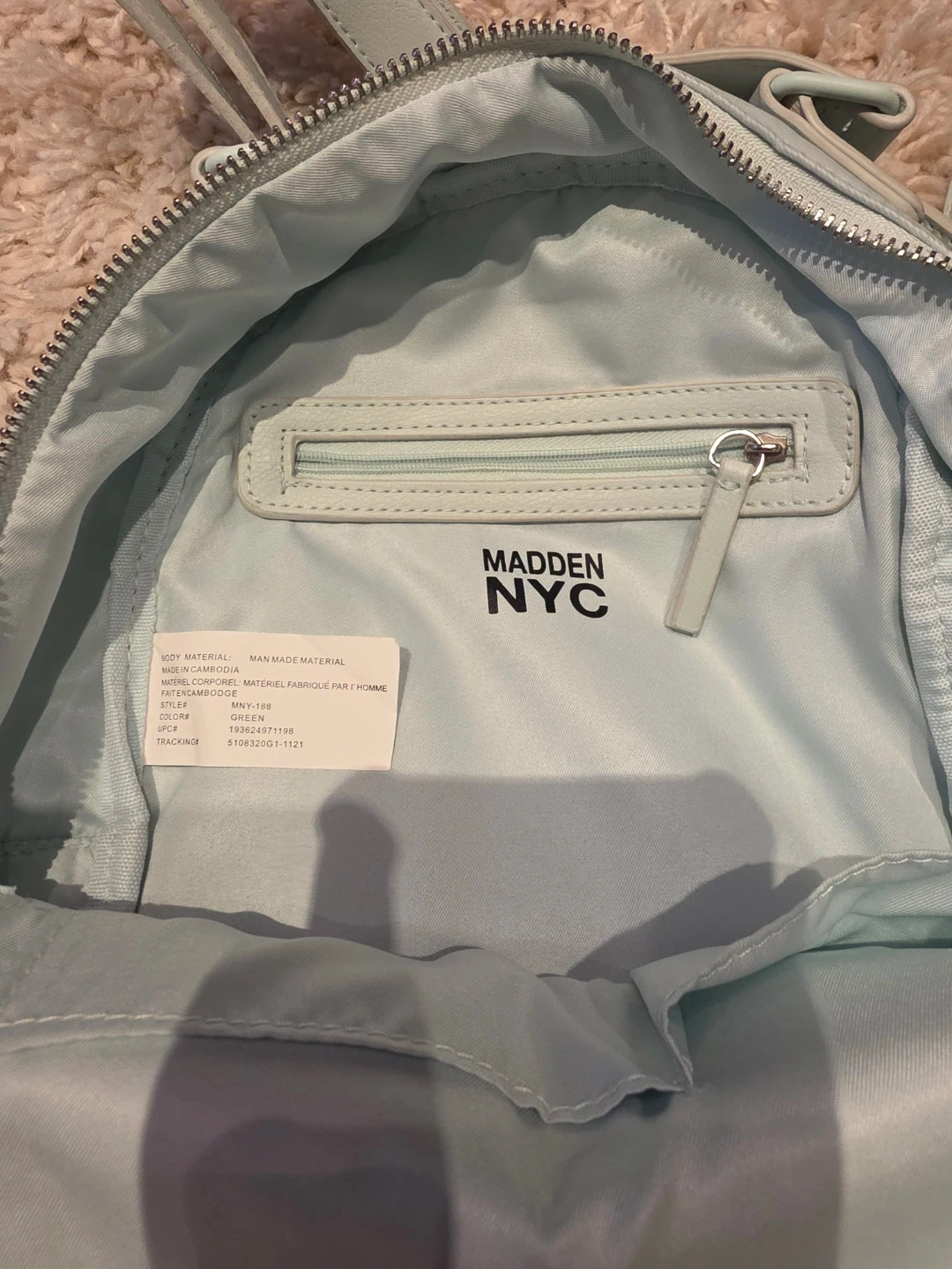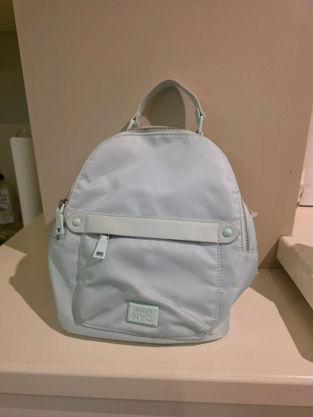 87Selling a cute Madden NYC mini backpack in a lovely light blue colour! It's perfect for carrying your essentials in style. The backpack features adjustable straps and a zippered closure to keep your belongings secure. The interior is lined and includes a small zippered pocket for added organization. It's in great condition and ready for a new home!