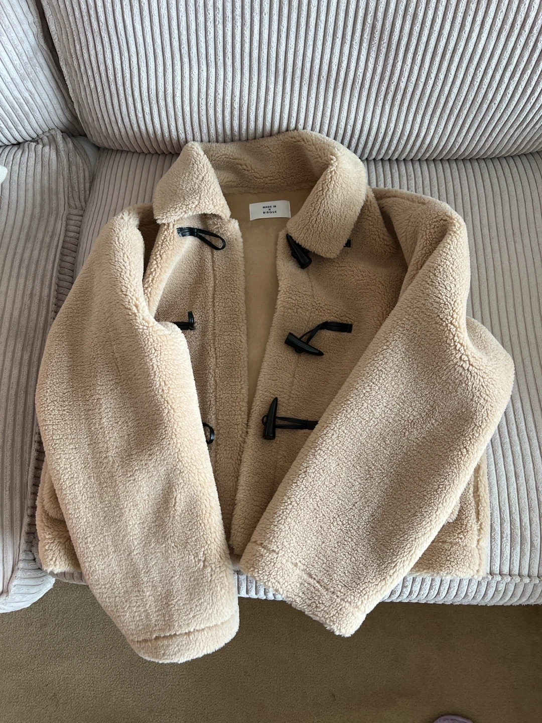92Cozy up in this cream-coloured sherpa duffle coat from Made in Bisque! It's super soft and perfect for chilly days.