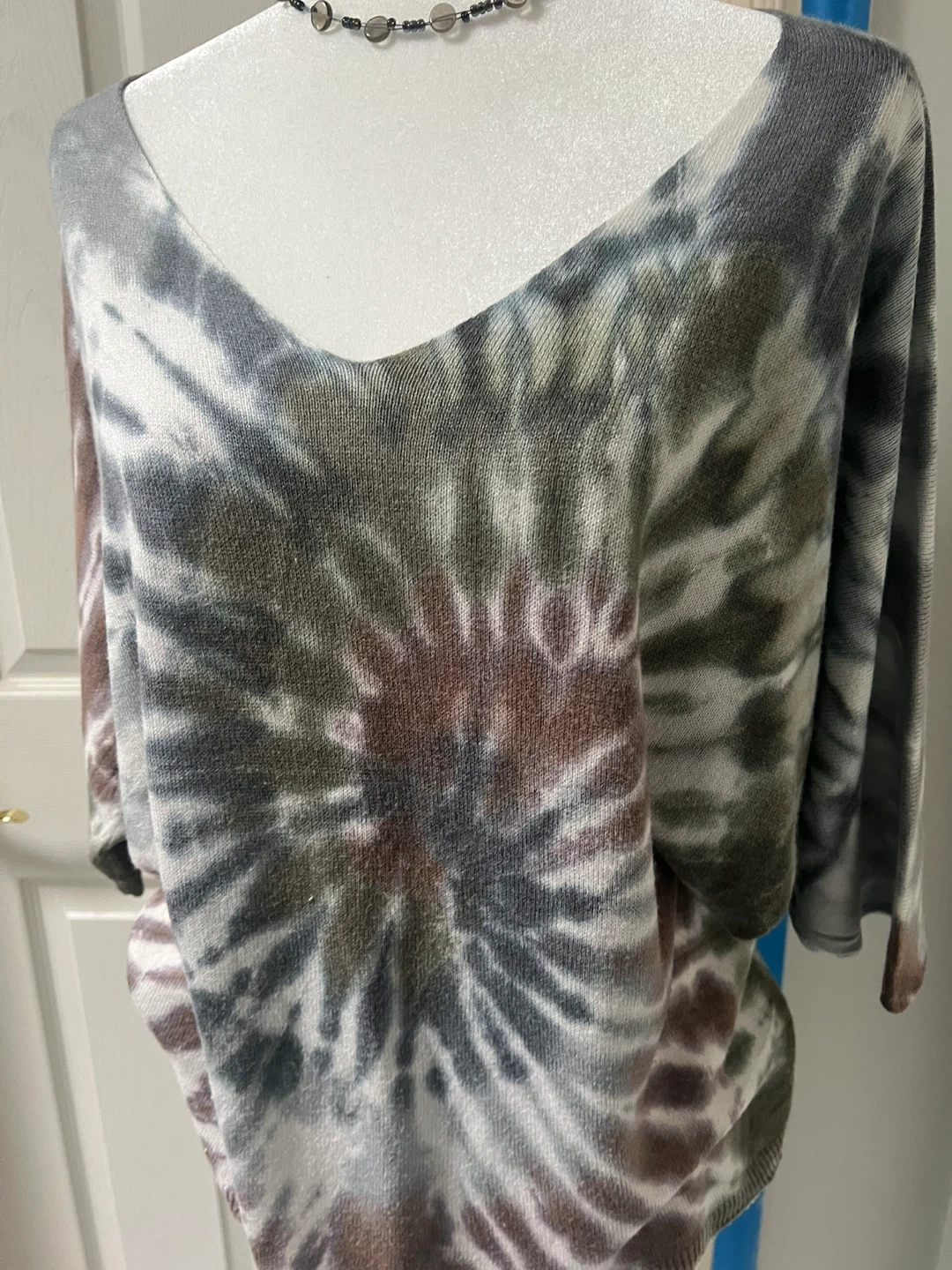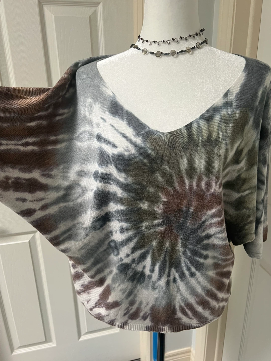 16Stylish tie-dye top with batwing sleeves. Features a blend of gray, brown, khaki and cream colors. Lightweight silky feeling knit fabric. New