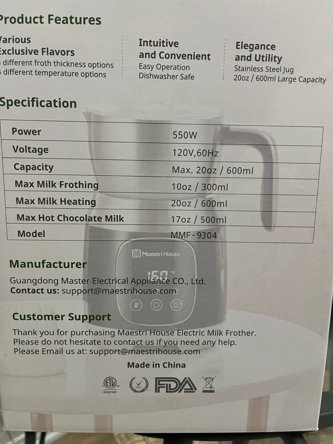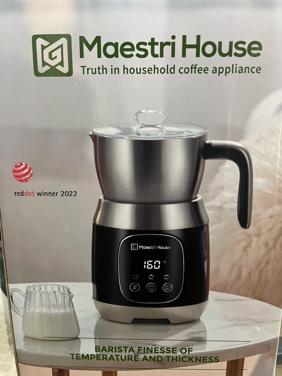 65Looking to sell my Maestri House electric milk frother! It's Brand new, never used and ready to make some delicious lattes and cappuccinos. Key features: - 4 different temperature options - Stainless steel jug (20oz / 600ml capacity) - Easy to clean and dishwasher safe It has a smart touch control display and detachable parts for convenient maintenance. The model number is MMF-9304 Original Amazon price is $130.00