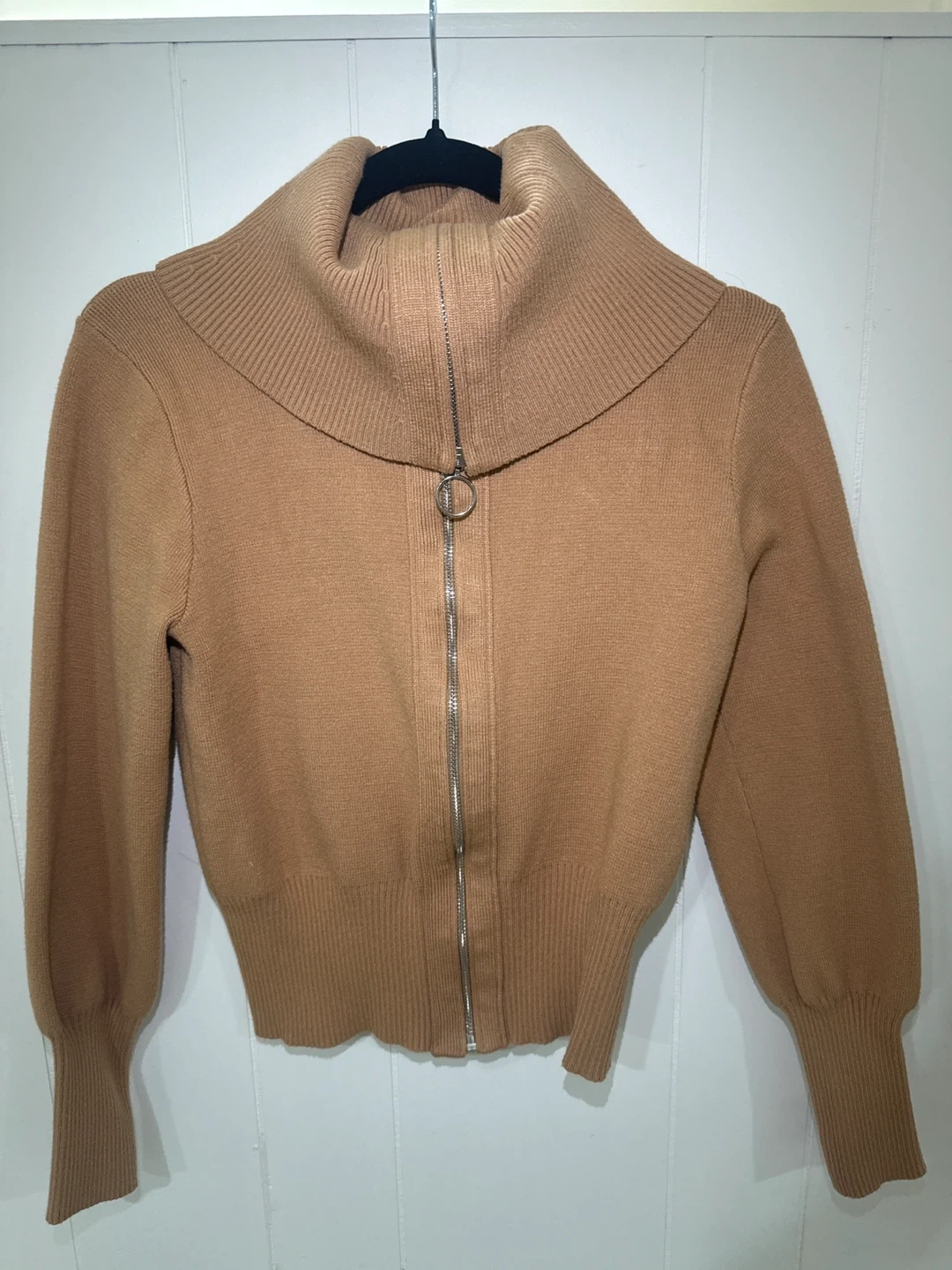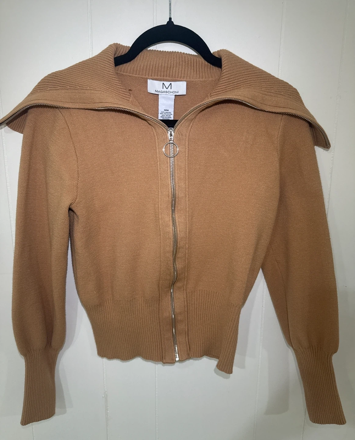 15Selling a Magaschoni zip-up sweater in a lovely tan colour. It's a size medium and made of a comfortable knit material. Perfect for layering or wearing on its own!