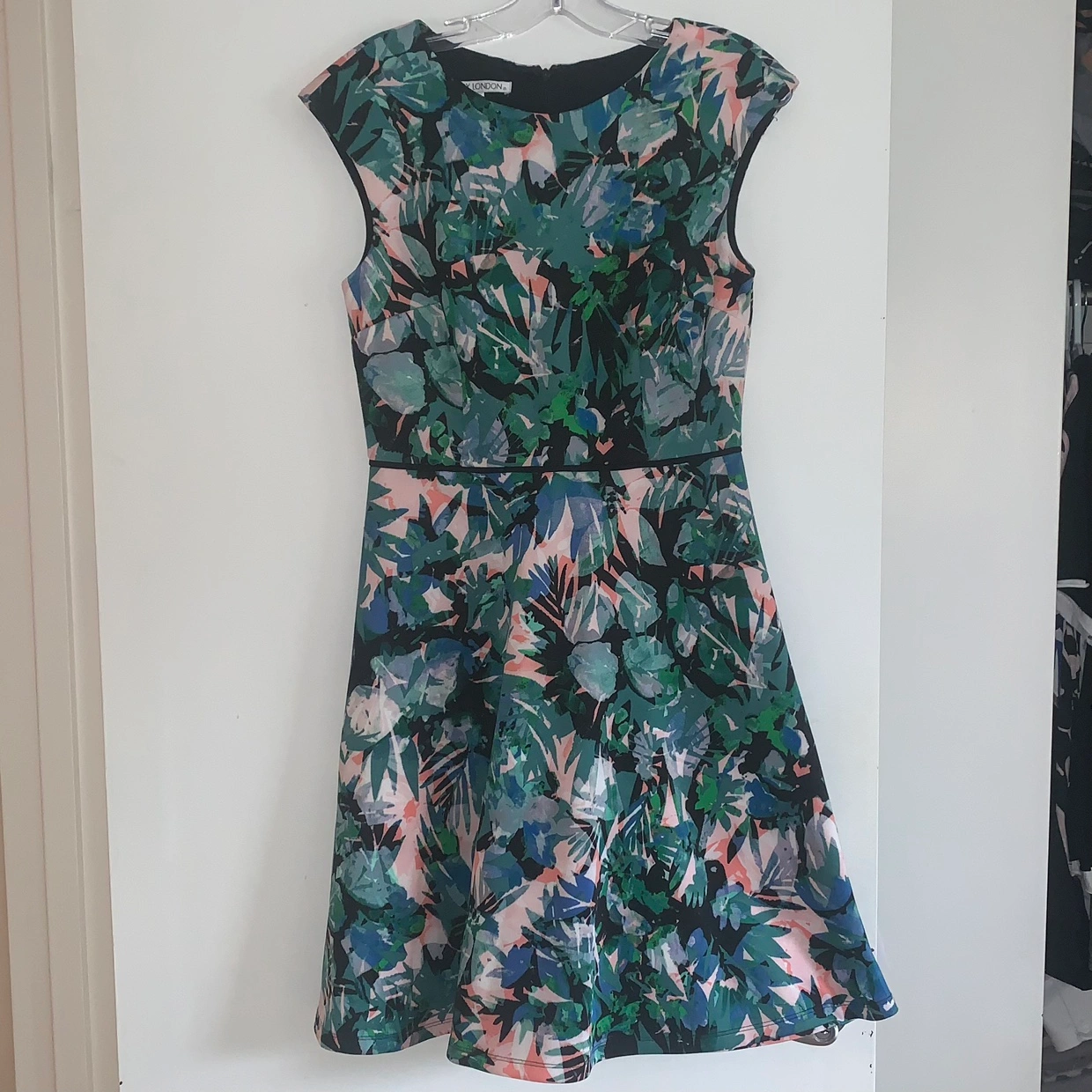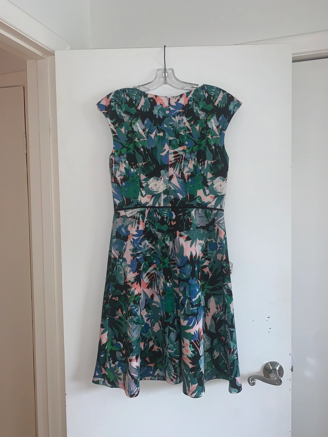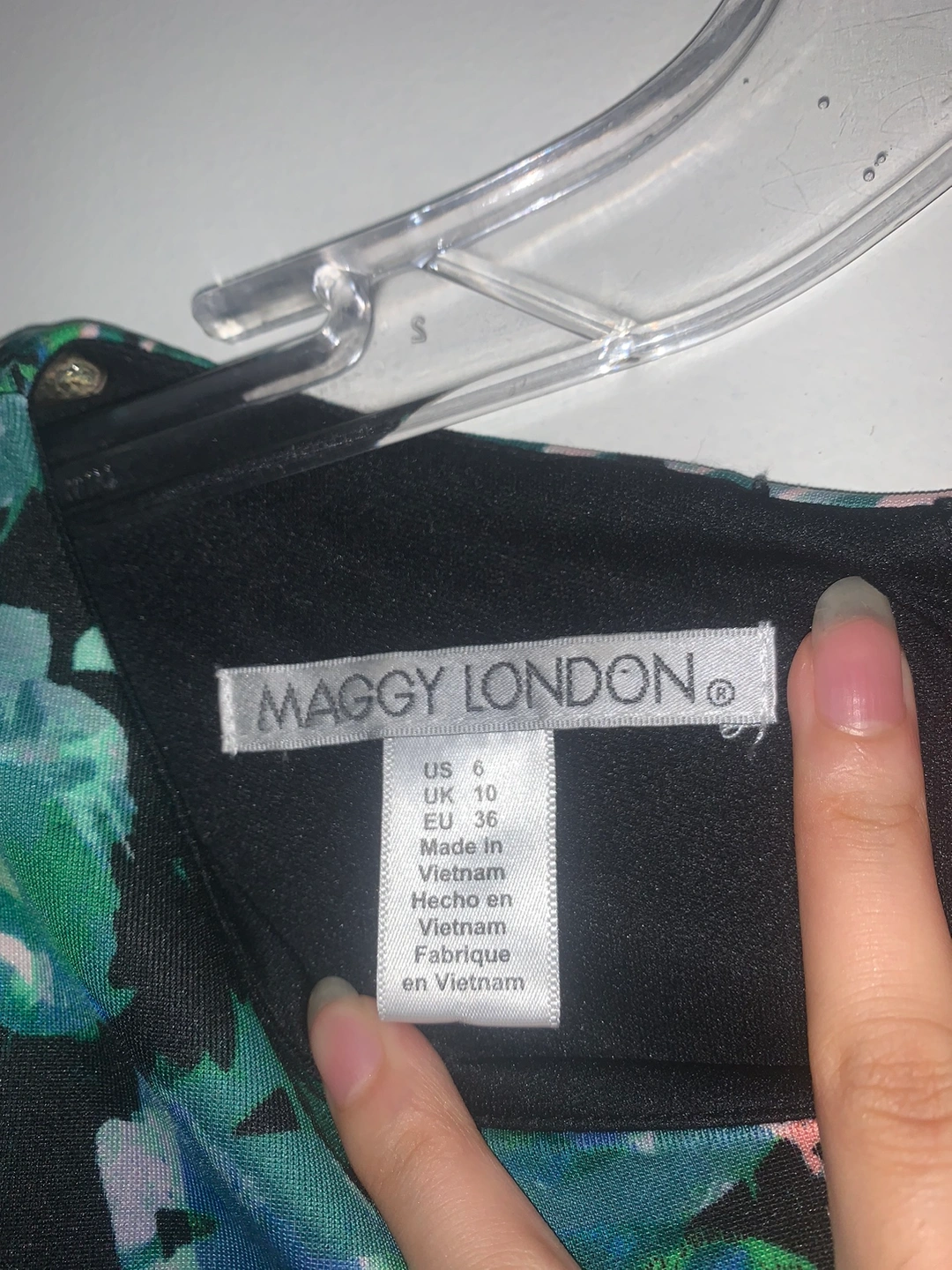 111A floral dress by Maggy London with short sleeves and a fit and flare silhouette. NWOT Size 6, true to size Perfect for spring/summer weddings Measurements laid flat (please note fabric has stretch): Chest: 17.5 inches Shoulder: 18 inches Full length: 38 inches Tags Zara aritzia wilfred babaton k crew banana republic hm oak fort frank club Monaco kate spade Ted baker