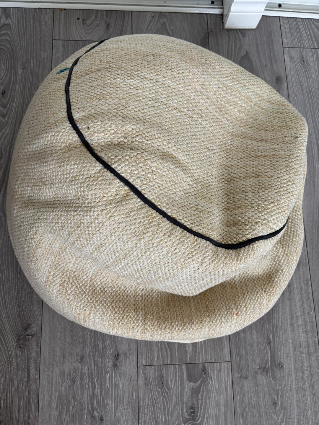 Bean bag chair with a neutral colour and a textured fabric. Features a black trim. This bean bag can be a relaxing spot after a long day.