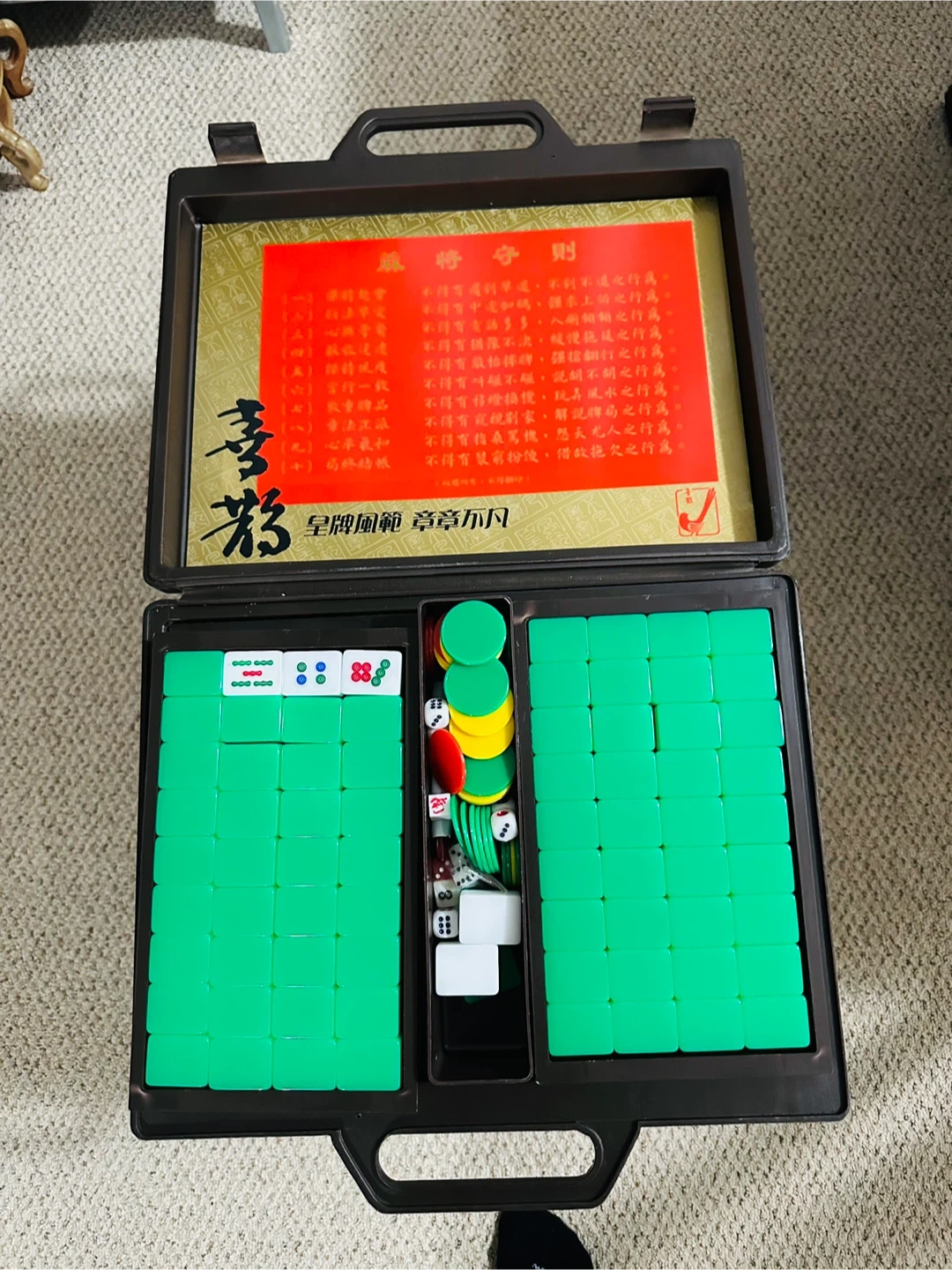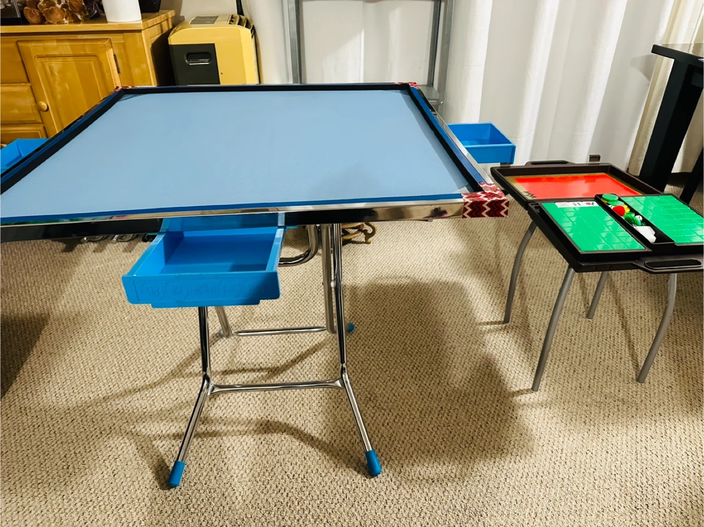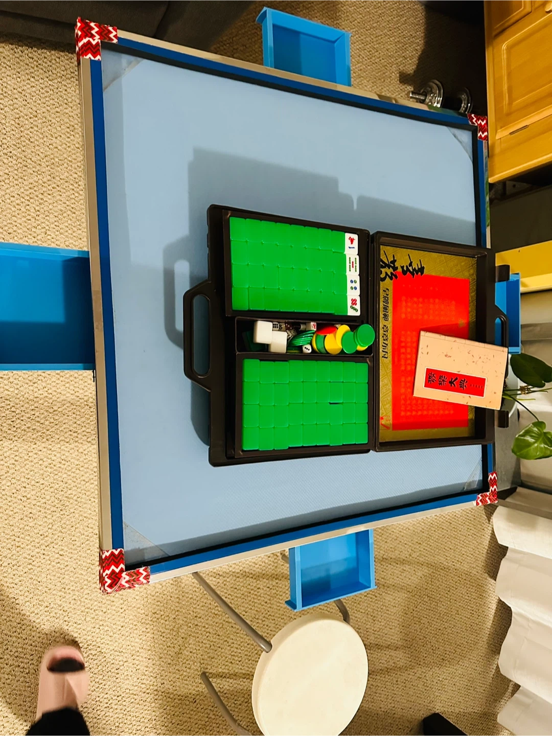 12Selling a mahjong table complete with a mahjong game set! The table features a blue playing surface and convenient built-in drawers for storing tiles and accessories. The set includes everything you need for a fun game night with friends and family