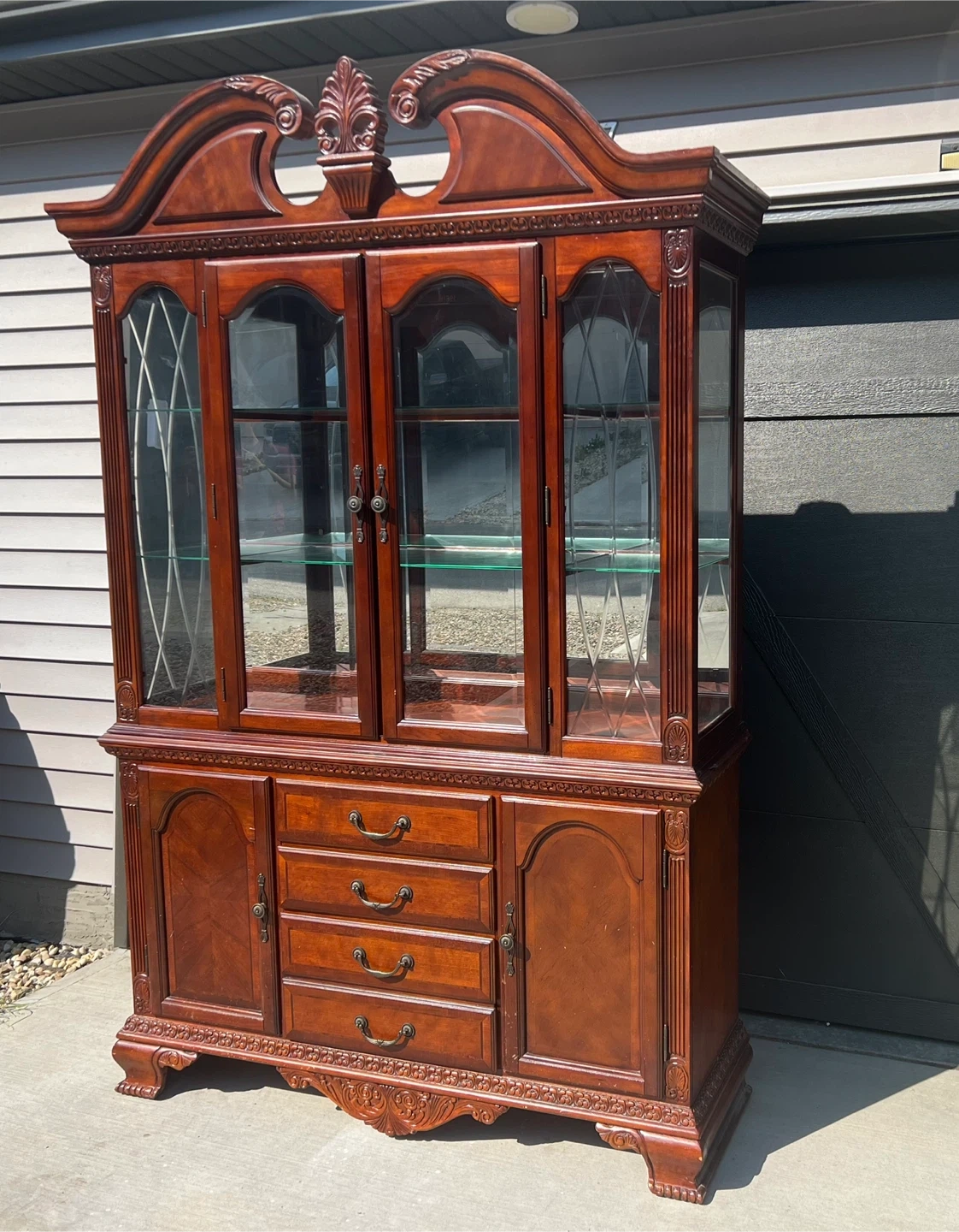 99Beautiful mahogany china cabinet with glass doors on top and drawers and doors on the bottom. It's in great condition and perfect for displaying your fine china or collectibles. The wood has a lovely, rich tone that would complement any dining room or living room decor. I can deliver.